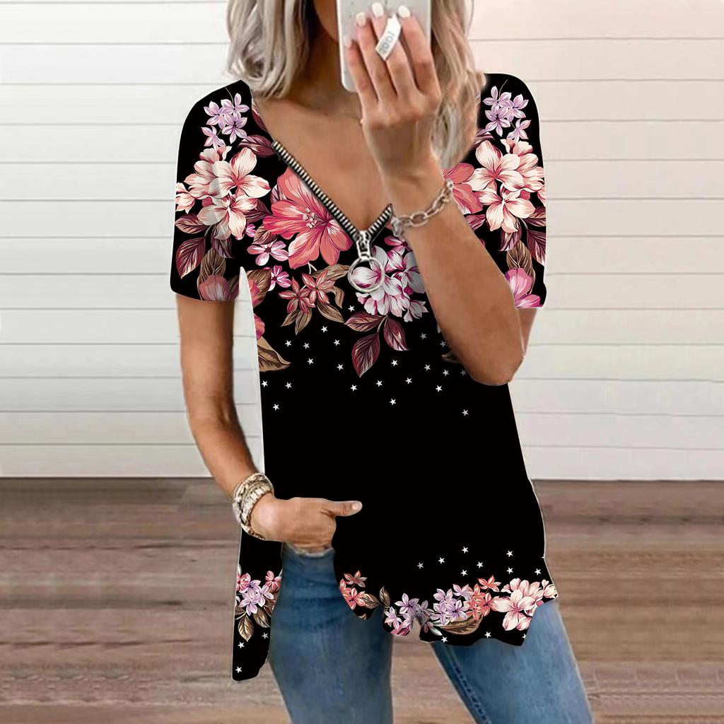 Women's Top Summer New Fashion Orange Peach Blossom Printed Casual Zipper V-neck Short Sleeve Top