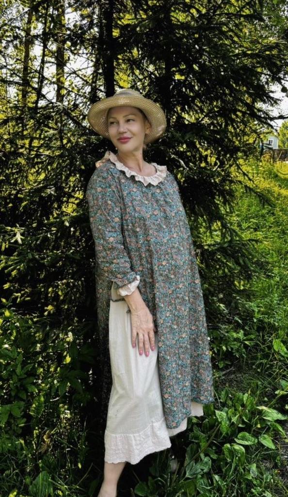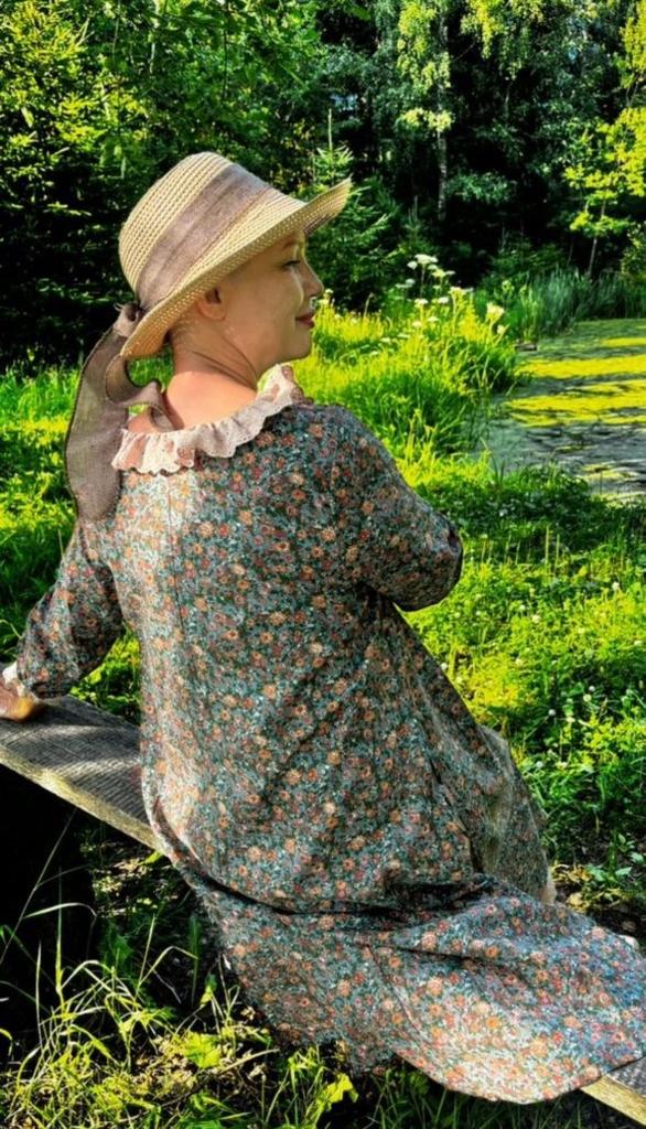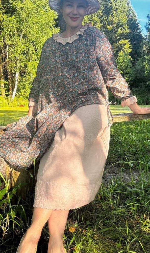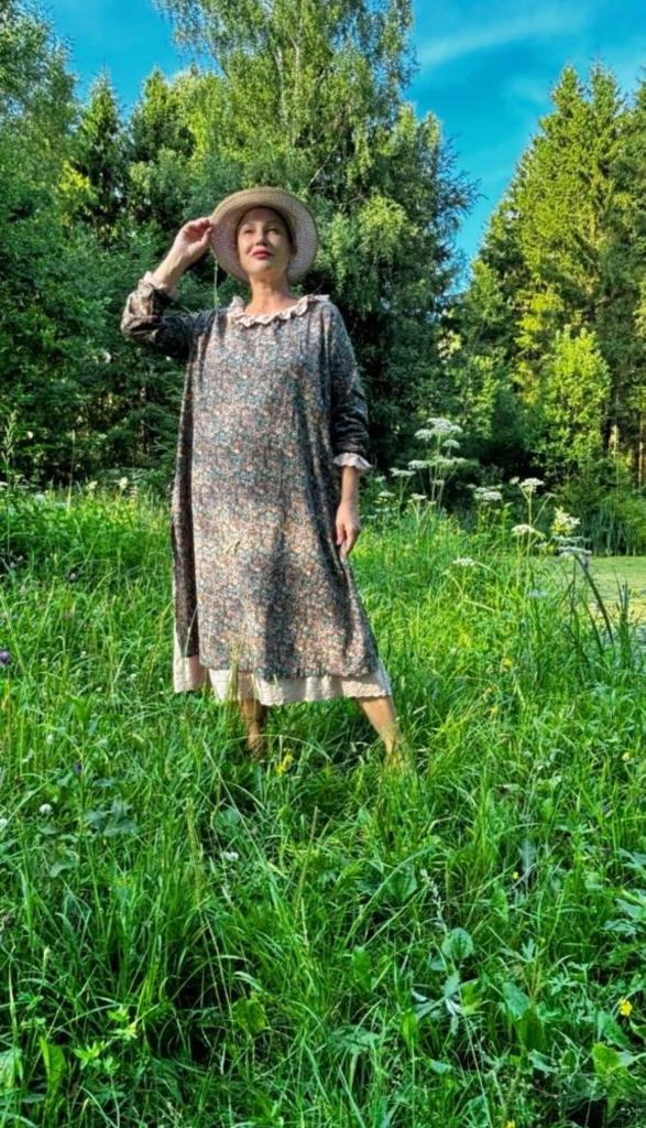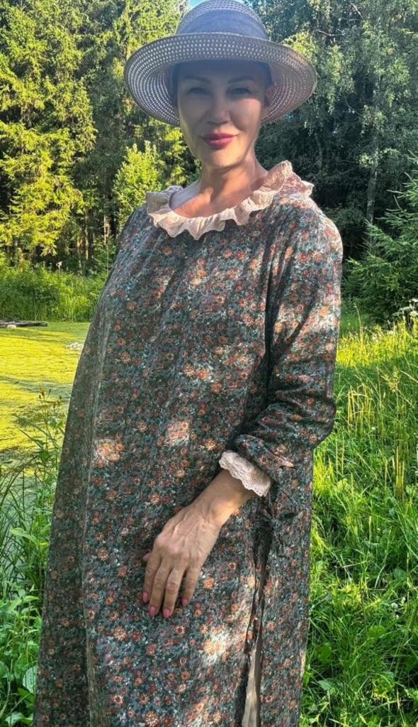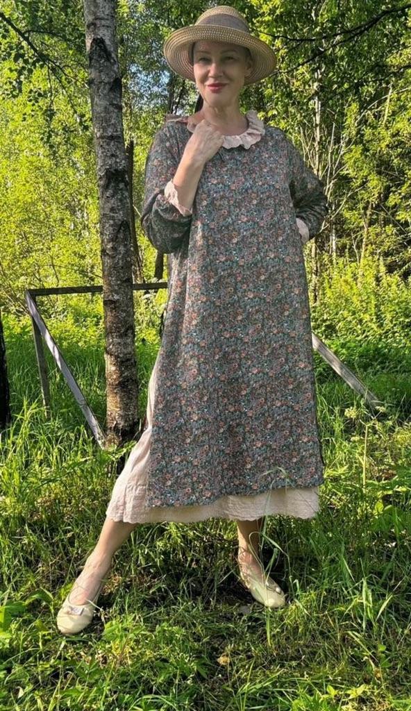 The dress is charming! The fabric is natural, smells like linen. The lining is very pleasant to the body. Thank you Jum!