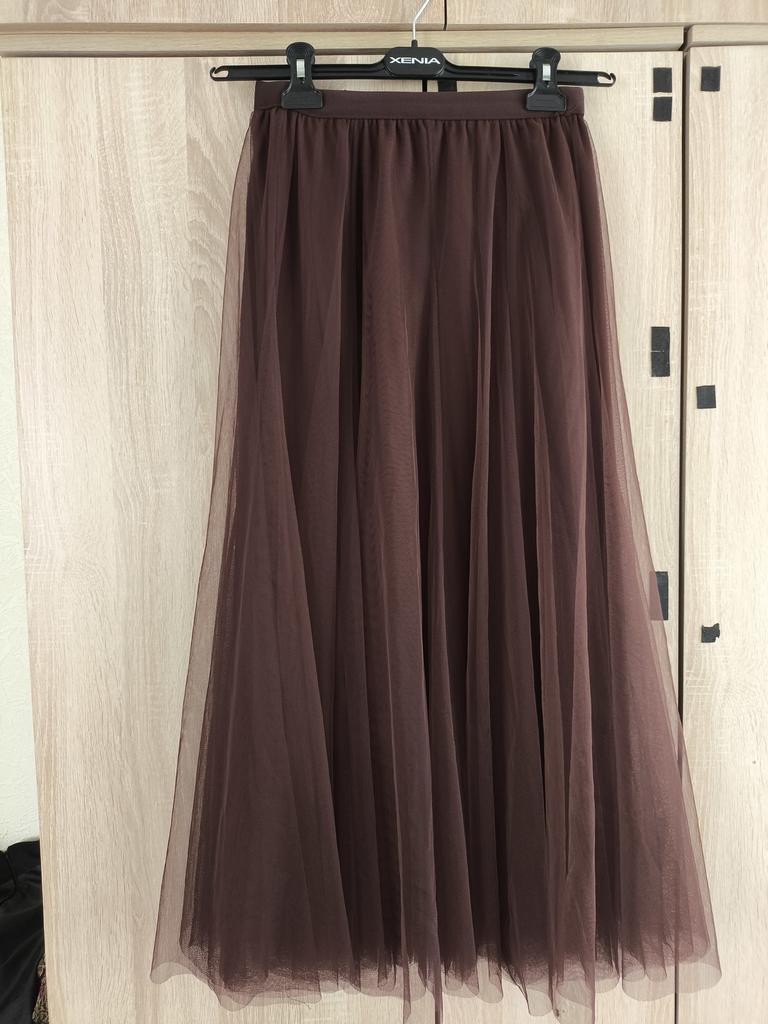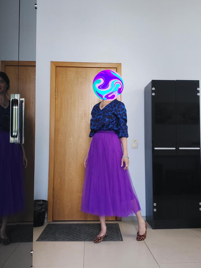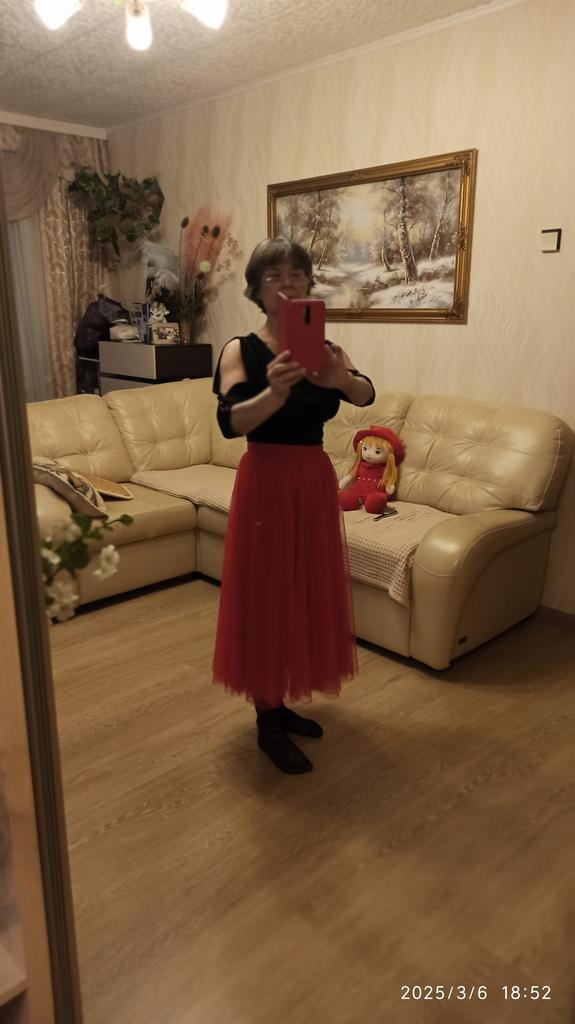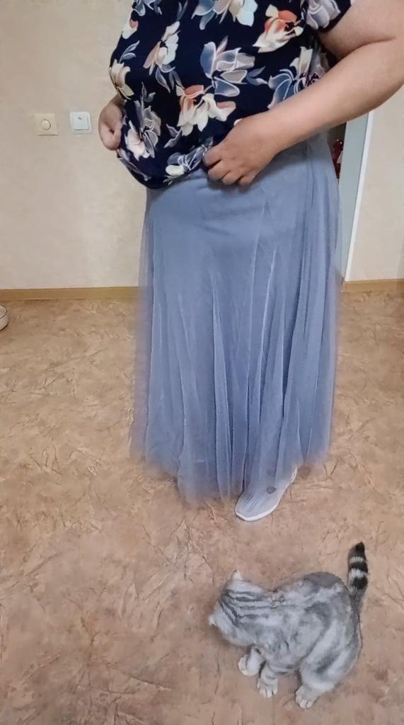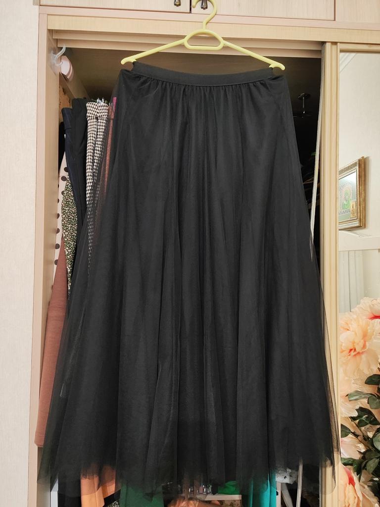 Voluminous skirt, mesh in two layers (a bit hot for summer). But overall it's elegant (great for New Year's holidays, you can also wear it to a concert if you choose a matching blouse). The elastic band in the waist is quite elastic, holds its shape well. For me, the black color of the skirt is better, because it's easiest to combine with the top of the outfit.