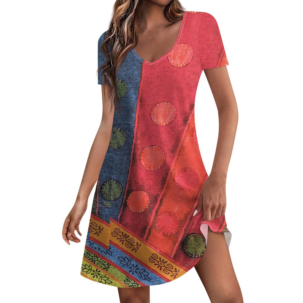 Women's Fashion Casual Printed With Pockets Bohemian Beach V-Neck Short Sleeve Dresses