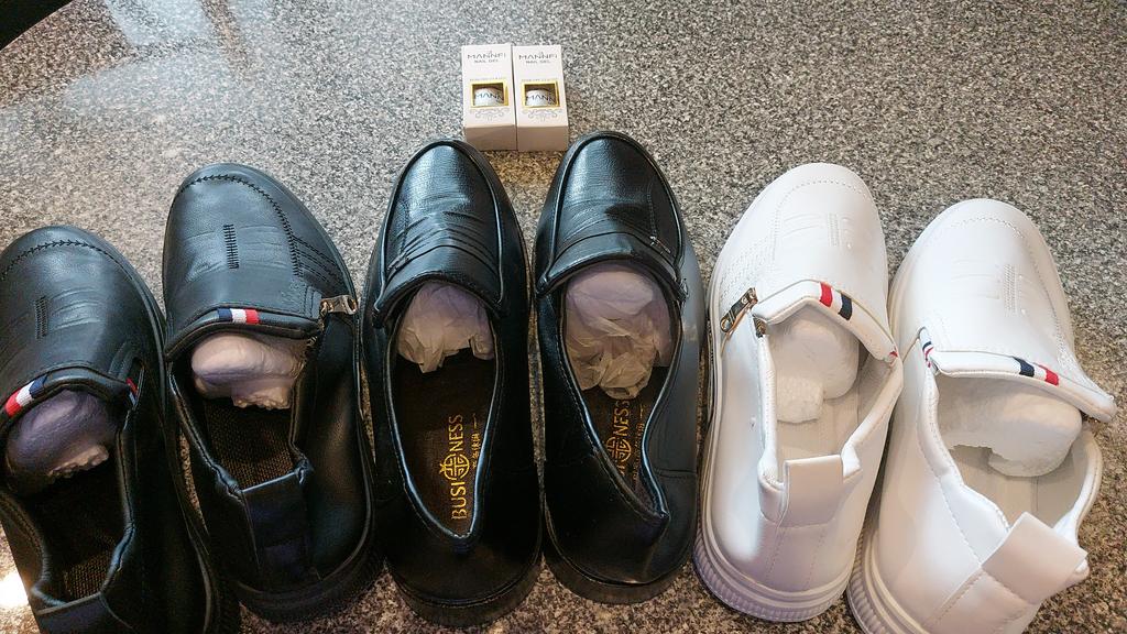 The T-shirt is completely gone. The beige shirt is 3 sizes too small. The shoes are good to size. The blue shirt is 1 size too small.
