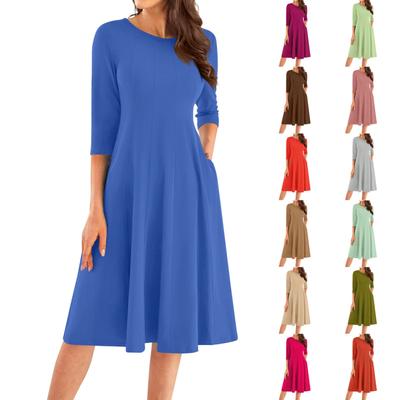 Women's Casual Fashion Round Neck Three Quarter Sleeve Solid Color Midi Dress