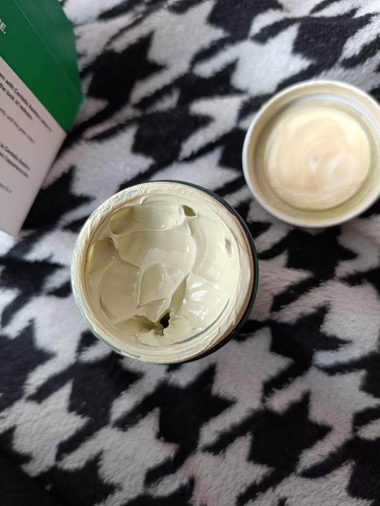 The cream will change from green to beige as you blend, visibly evening out skin tone.