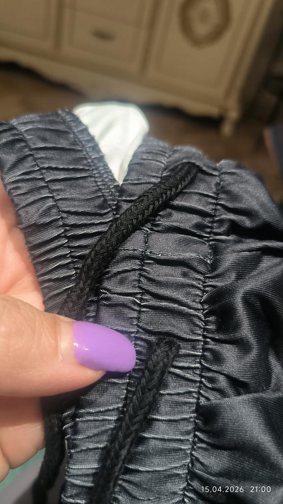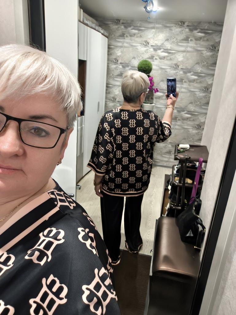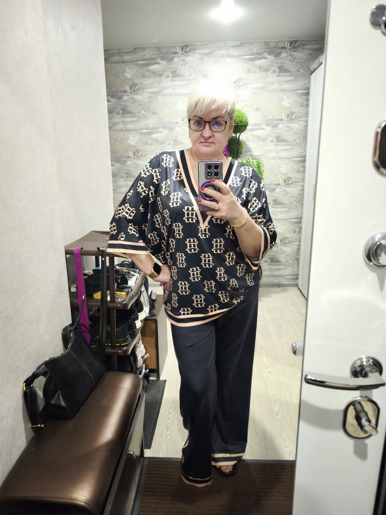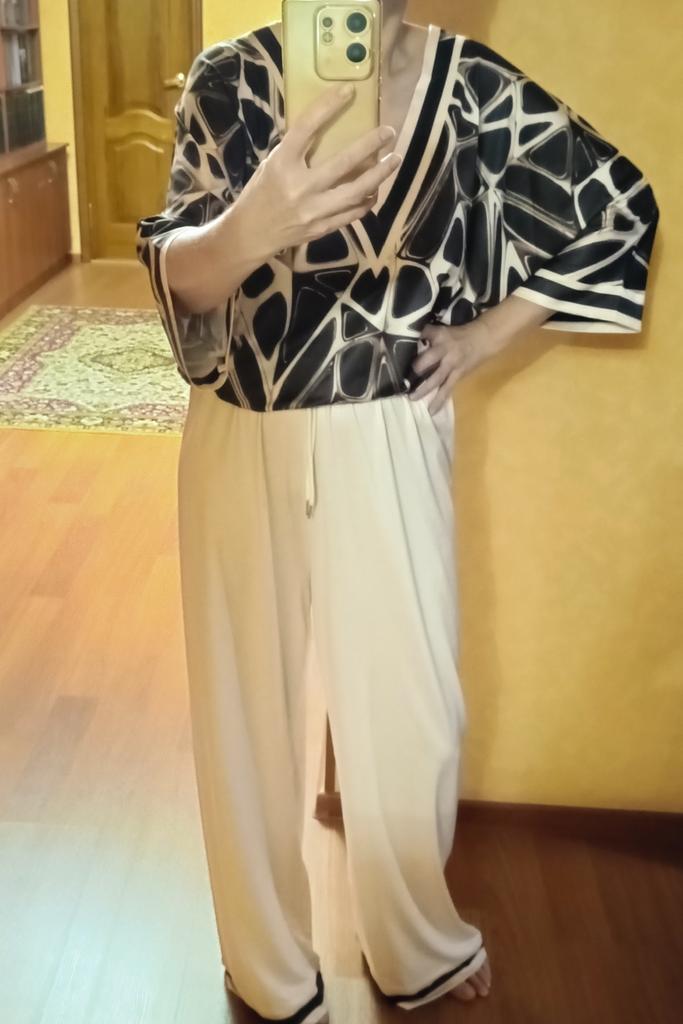 Long pants. The blouse presses at the waist. Wide