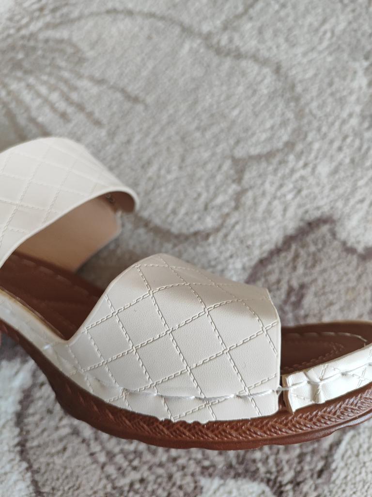 The sandals are not white, but milky. Very comfortable, soft sole. I will wear them next summer.