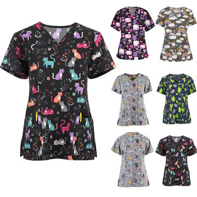Plus Size Cute Printed Scrub Working Uniform Tops For Women Cross V-Neck Short Sleeve Fun T-Shirts Workwear Tee With Pockets