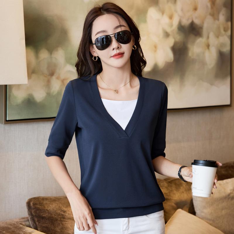 Summer Women's Blouse Clashing V-Neck T-Shirt Short Sleeve Top
