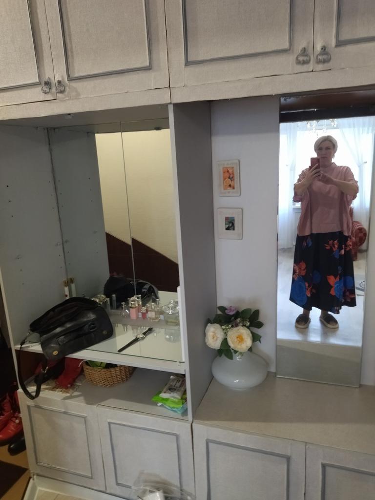 Very wide blouse, 45% rayon, 55% polyester. The material is light, pleasant. The sleeves are narrow, but everything fits, that's the style. Minus --- the closure on the back sticks out, something needs to be done.
