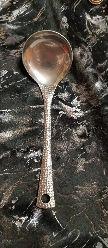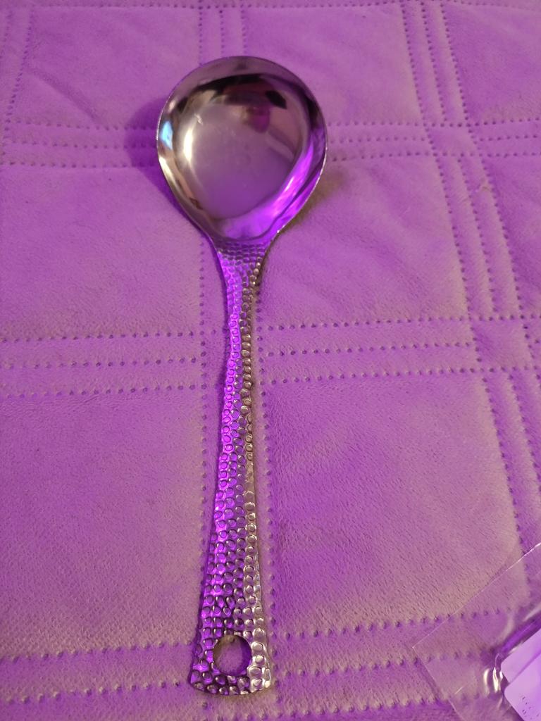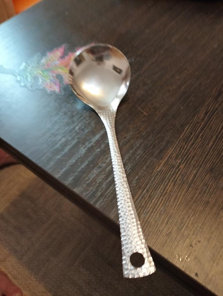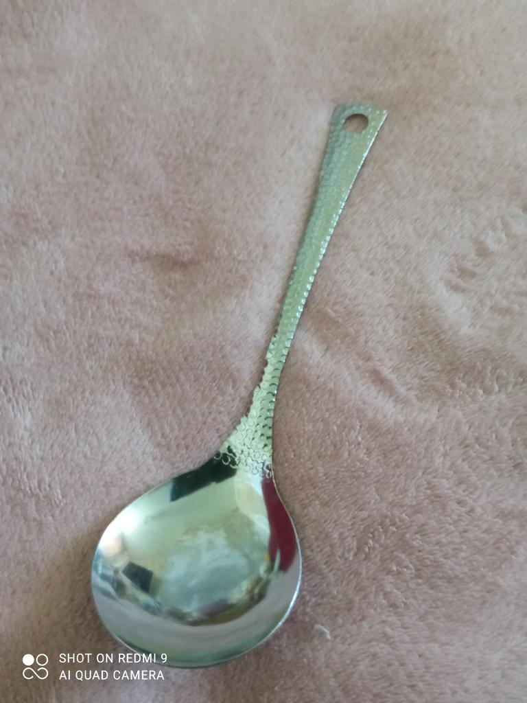 A convenient, large and beautiful spoon. It was exactly what I was missing, because it was inconvenient to put food in a small plate or bowl with a ladle. I recommend it.