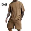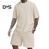 The men's two-piece set features a short-sleeved top and elastic-waisted shorts, designed for a casual and comfortable fit that complements various body shapes.