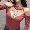 Women's Sexy Deep V Low Cut Bottoming Shirt Perspective Mesh Hollow Long Sleeve Off Shoulder Top