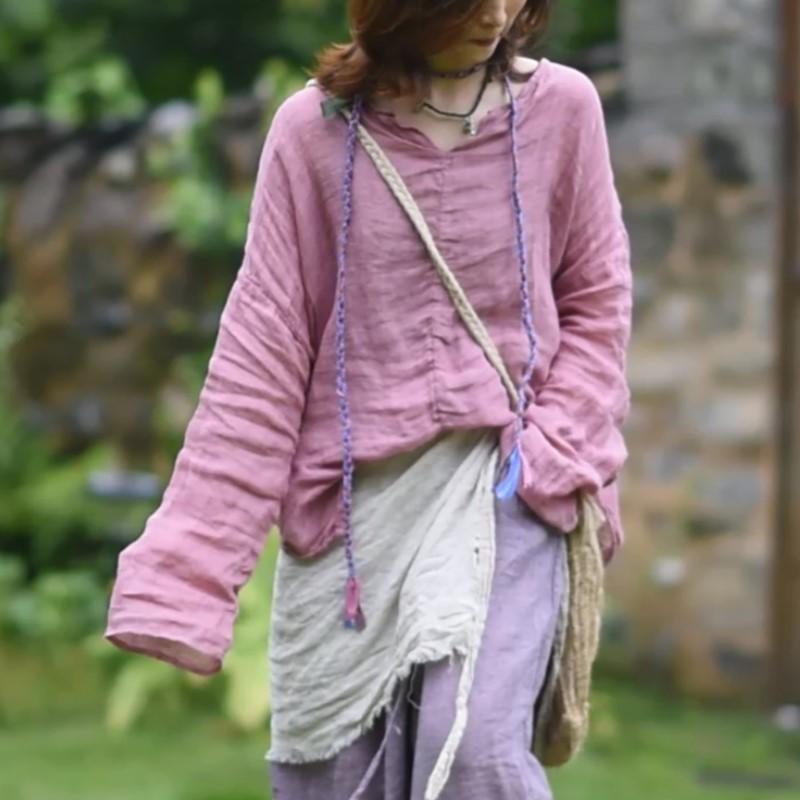 Johnature Women Vintage T-Shirts V-Neck Long Sleeve Solid Color Spring Casual Loose Women T-Shirts Soft