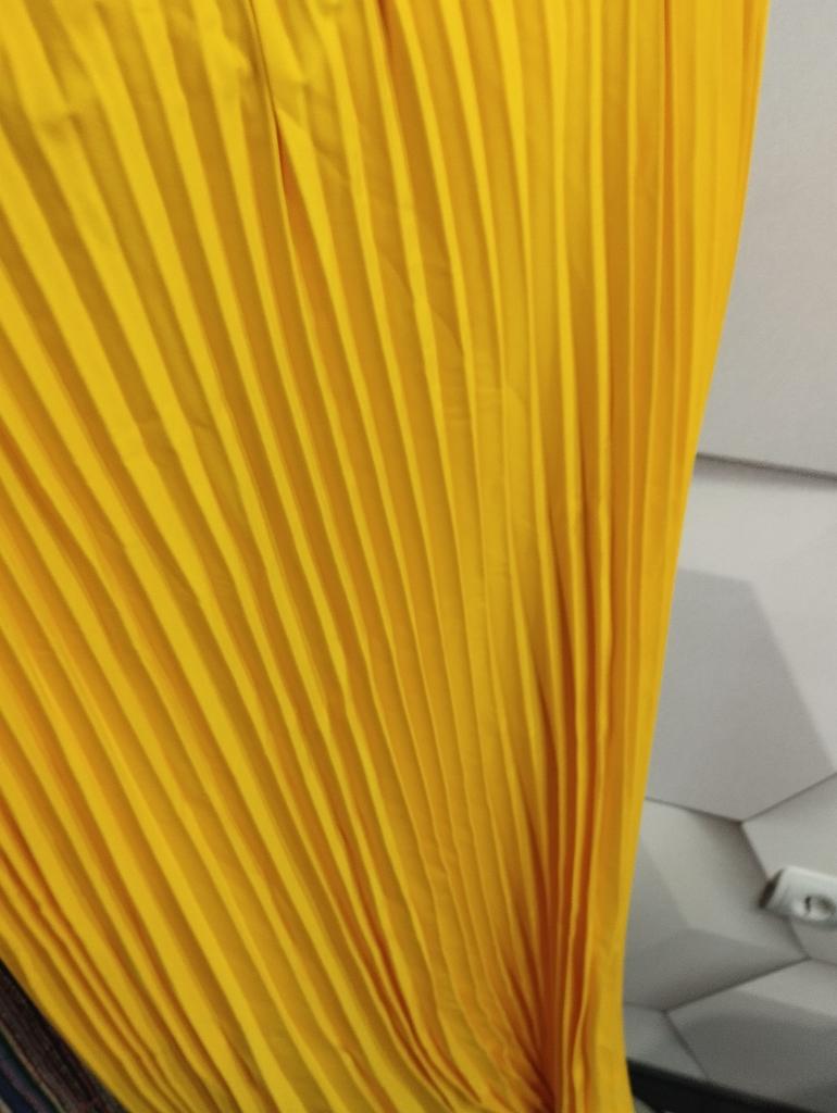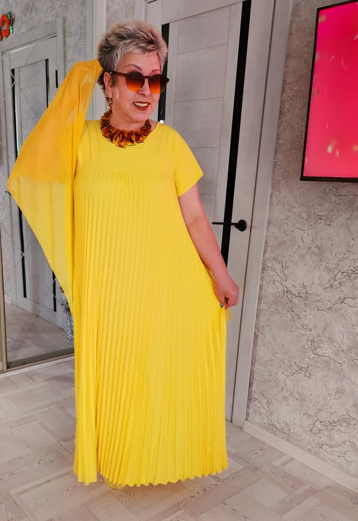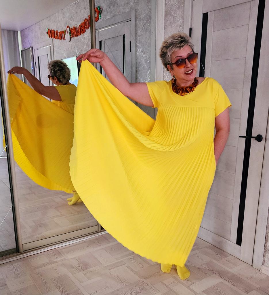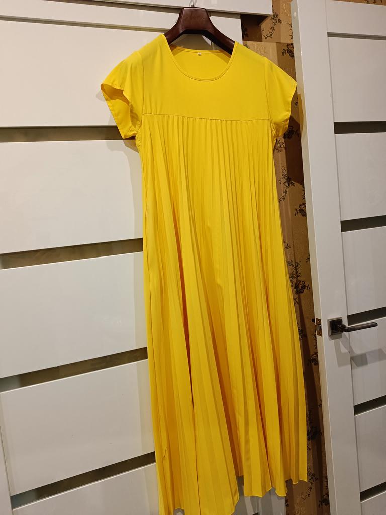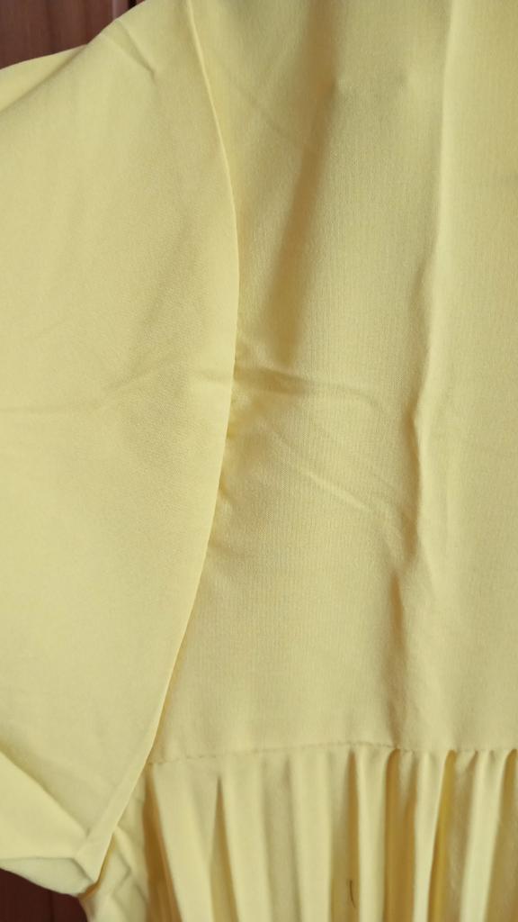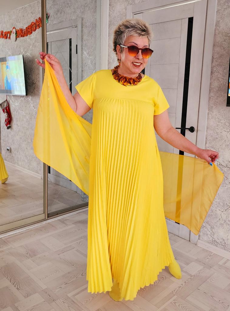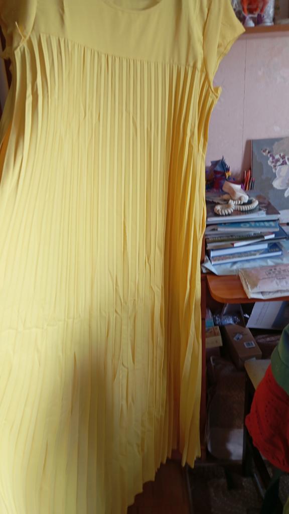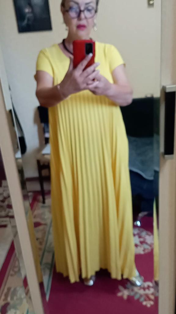 The dress is a pleasant, rich yellow color. It fit in size. One drawback: it is very long "to the floor" and a little see-through. I think I will make a skirt and a blouse. With the blue flower that I purchased on Joom, it will look lovely!