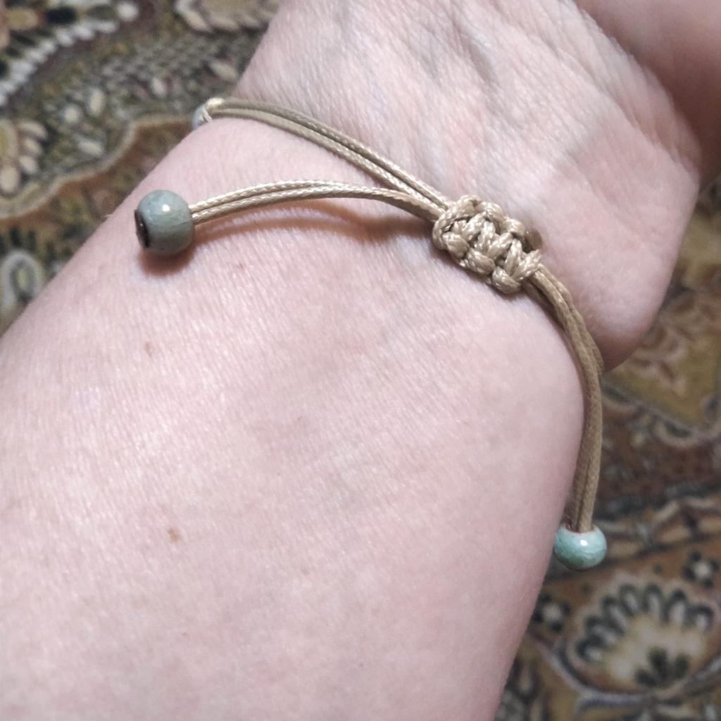 Very nice bracelet. Looks and is made very beautifully and qualitatively. Convenient tightening with beads. The tightening-lock needs to be additionally glued or welded. It has unraveled. It is good that I know how to tie such knots.