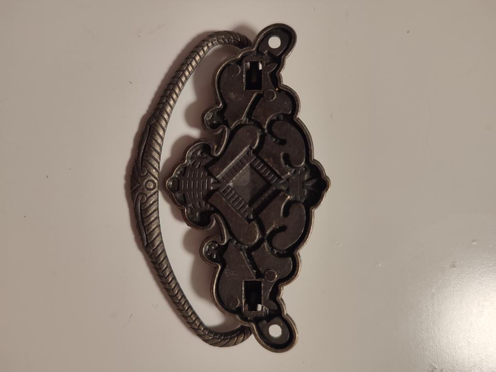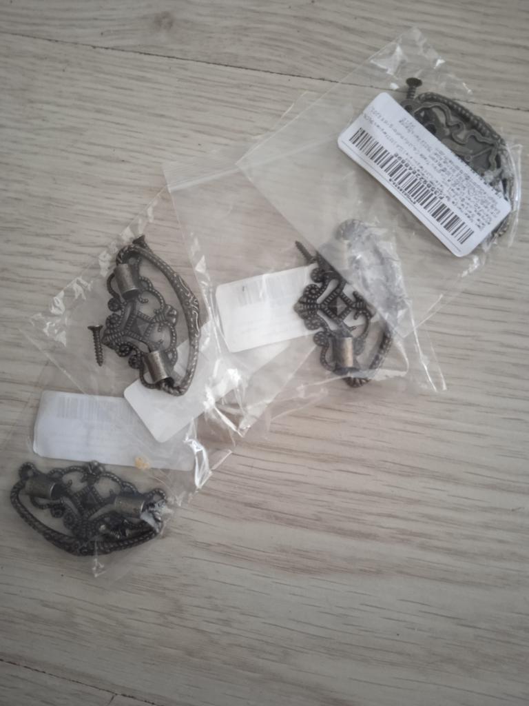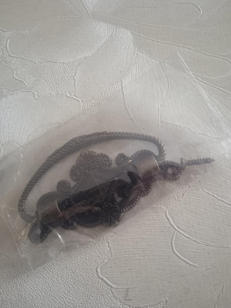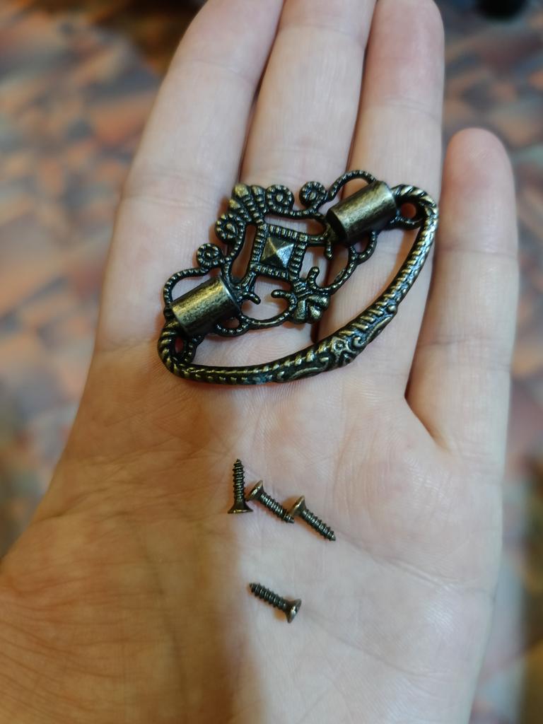 The handle is beautiful, in a vintage style, bronze-colored, small, size 4.8-2.8 cm, small screws for two holes are included. Suitable for small drawers and a jewelry box lid. I recommend it for ordering.