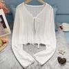 White Tie Up Summer Cardigan Women Sexy Long Sleeve Sheer Mesh Crop Tops Woman Chic All Match Short Printed T Shirt Mujer