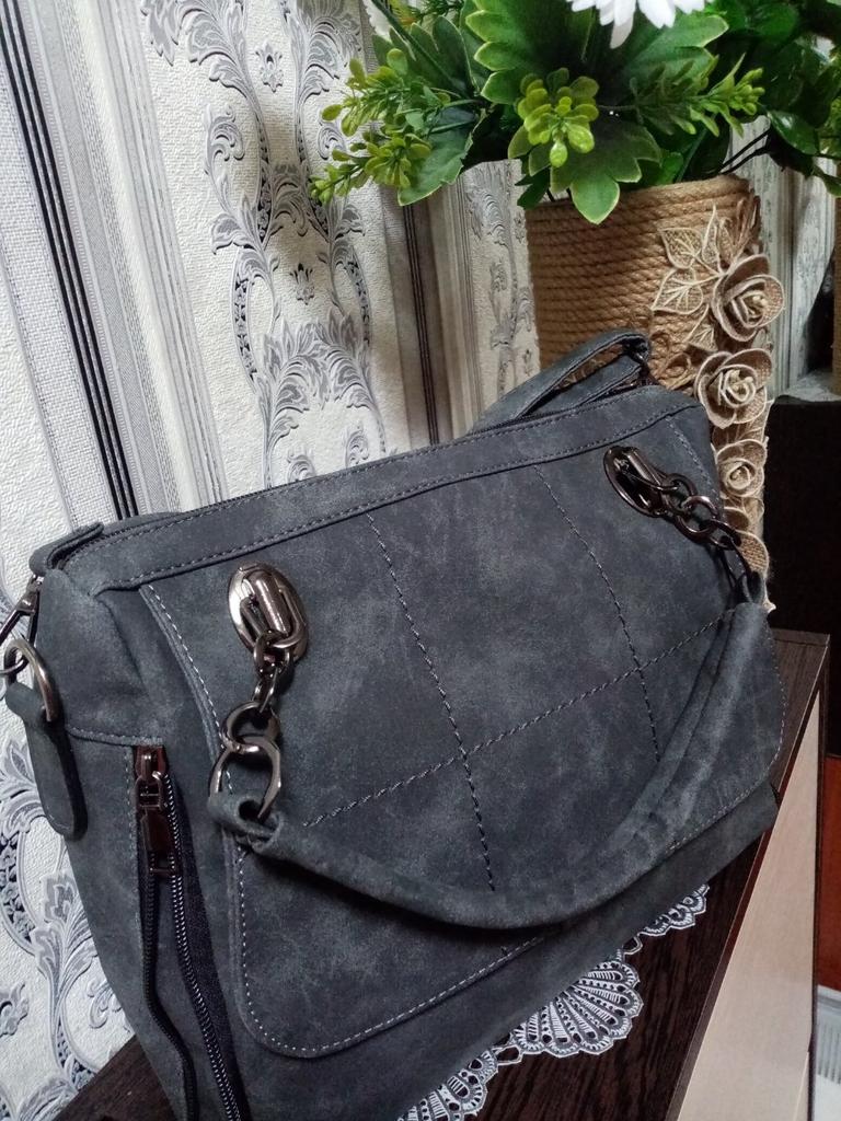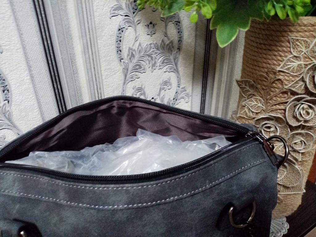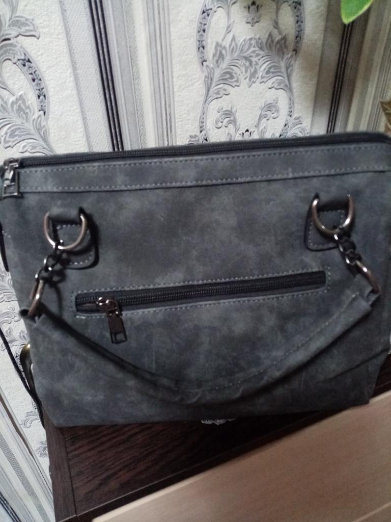 Good bag, comparatively large. Made to look like suede, rough to the touch. The color is not black, but dark gray. There is a blurriness in the color, mixing of paints.. Good dark hardware (I don't like the cheap yellow color). The sizes correspond. There is a BUT: few pockets.
