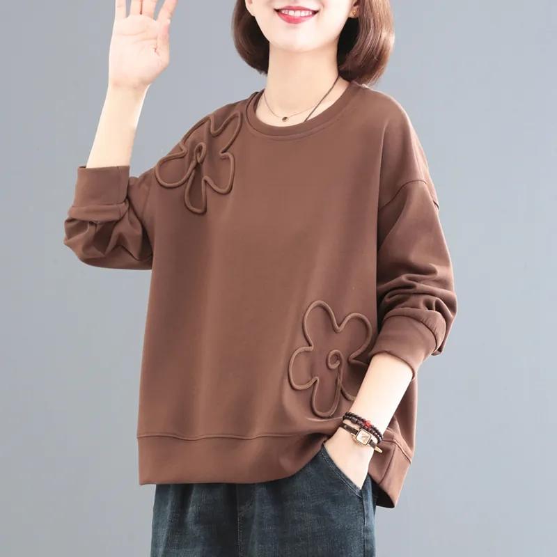 Women's Spring and Autumn Large Size Cotton Sweatshirt Solid Color Round Neck Loose Pullover Top