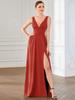 Features: Fully lined, no built-in bras, high stretch, deep v-neck, sleeveless, open back, high elastic knit, a-line, side slit, pleated, bridesmaid dress, evening gowns.