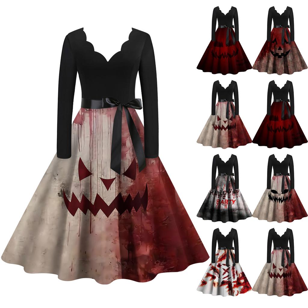Halloween Women's Casual Fashion V-Neck Printed Vintage Dress