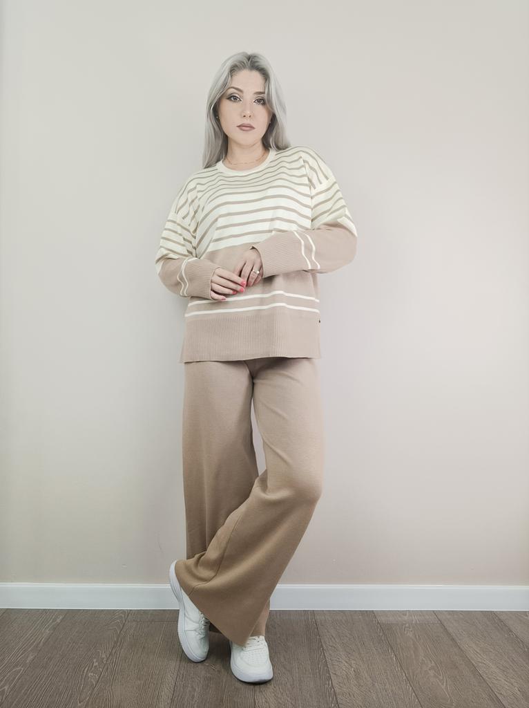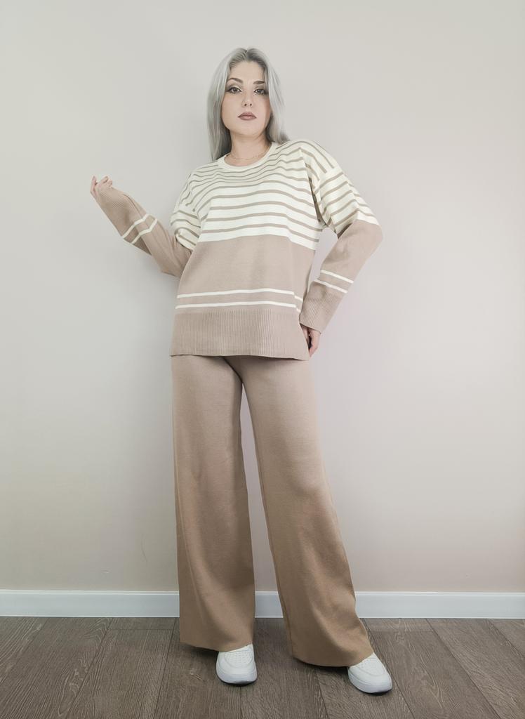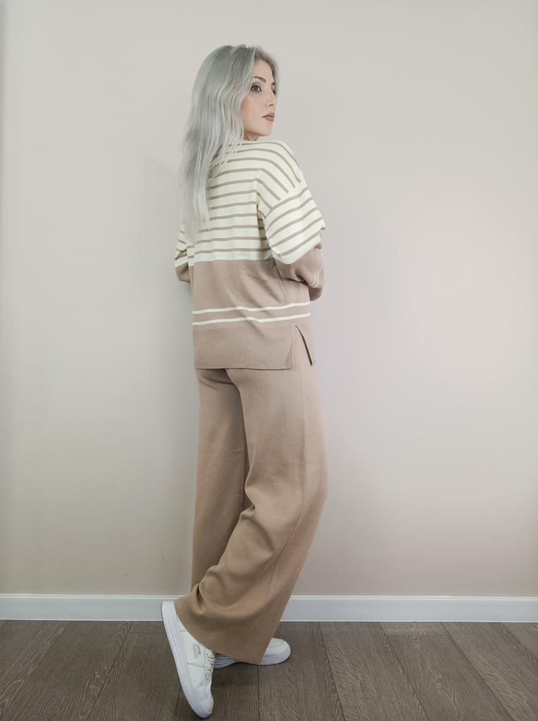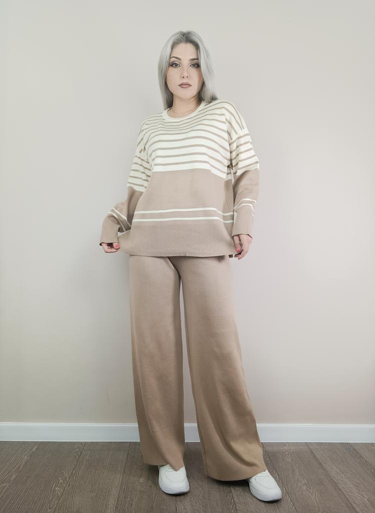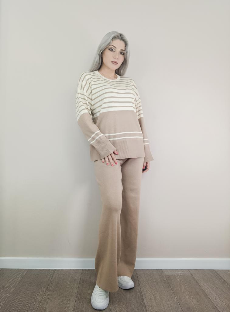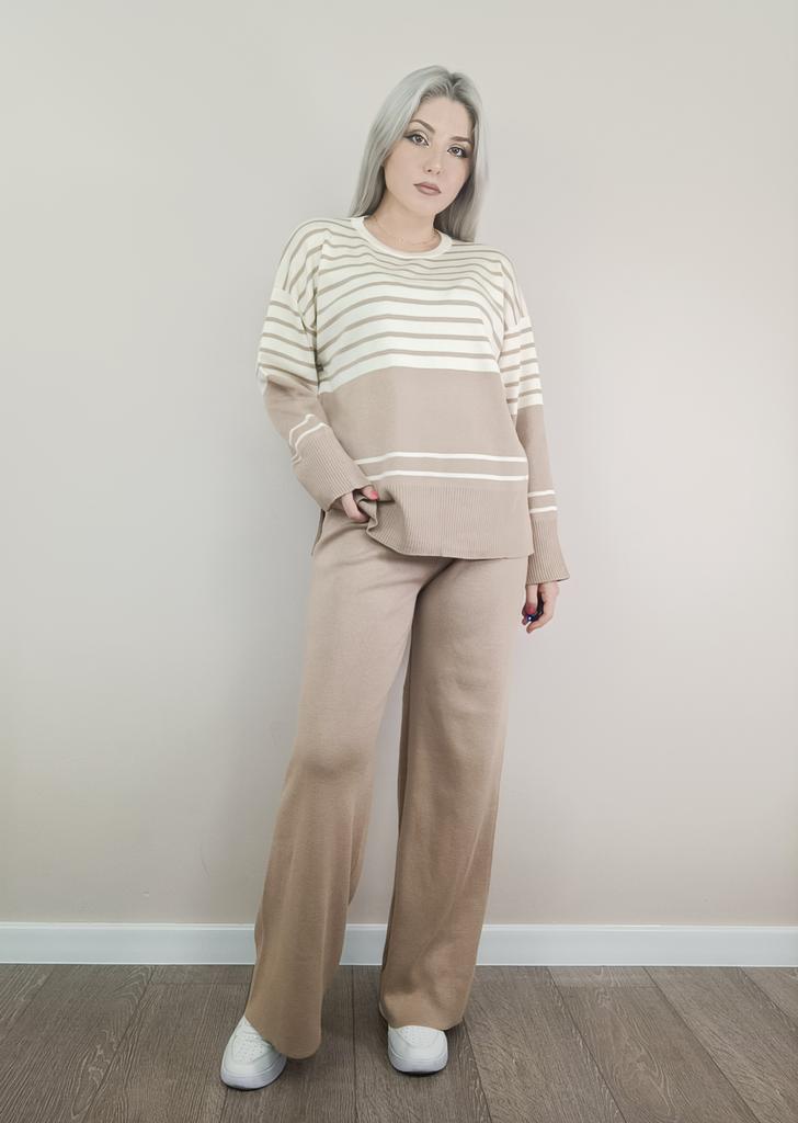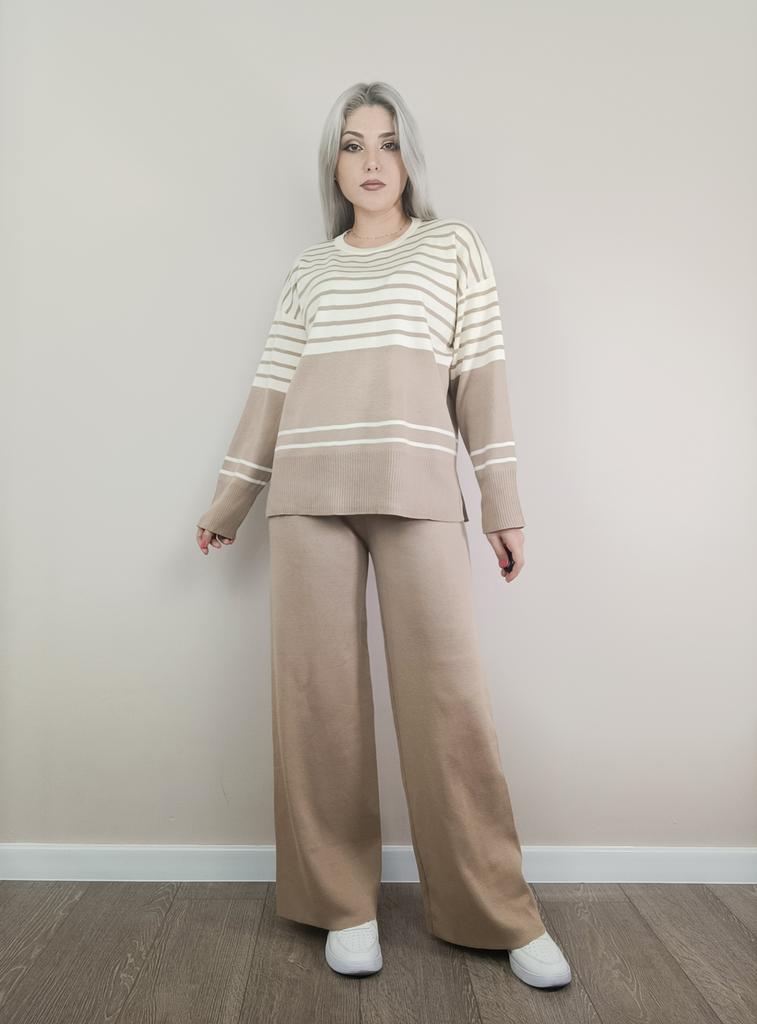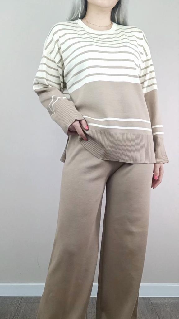 Fall Winter Lazy Wind Loose V-Neck Pulllover Sweater Suit Women's Stripe Long Sleeve Knit Wide Leg Pants Two Piece Set