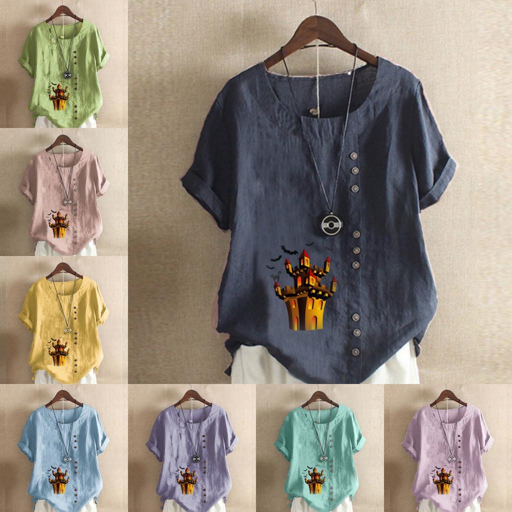 Women's Fashion Haunted House Prined Round Neck Short Sleeve T-shirt Casual Cotton Linen Graphic Shirt Leisure Loose Summer Blouse Tops