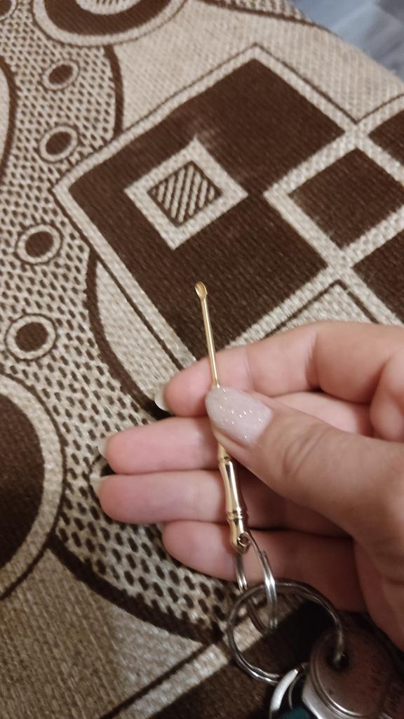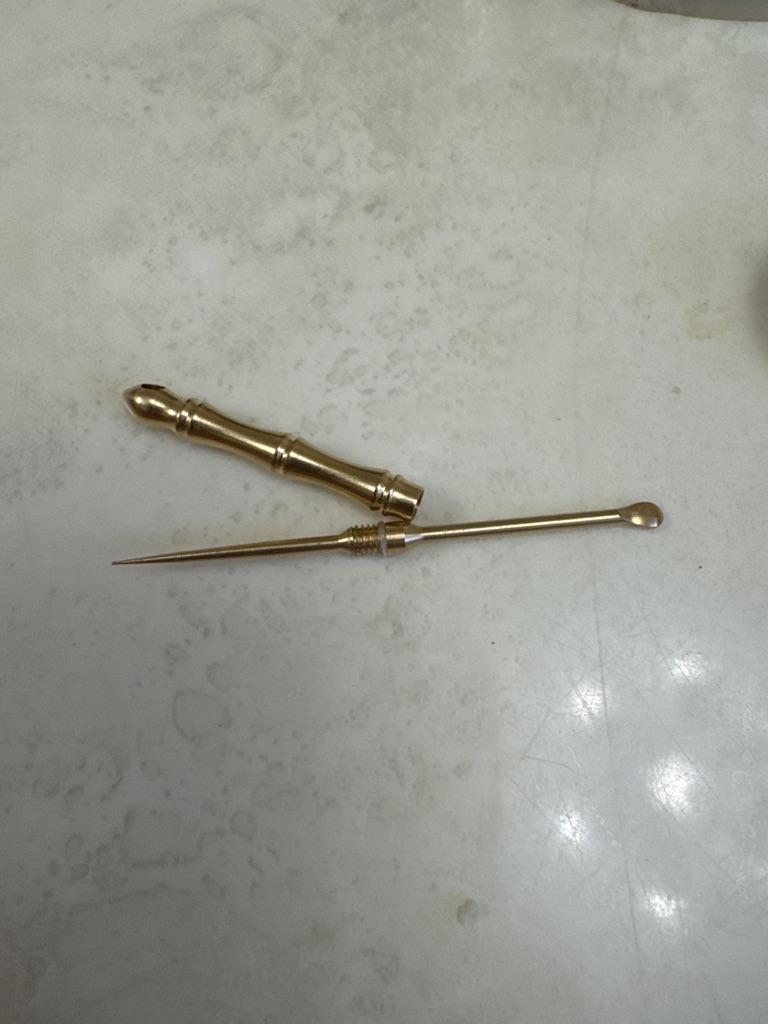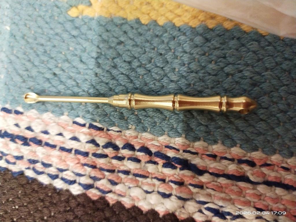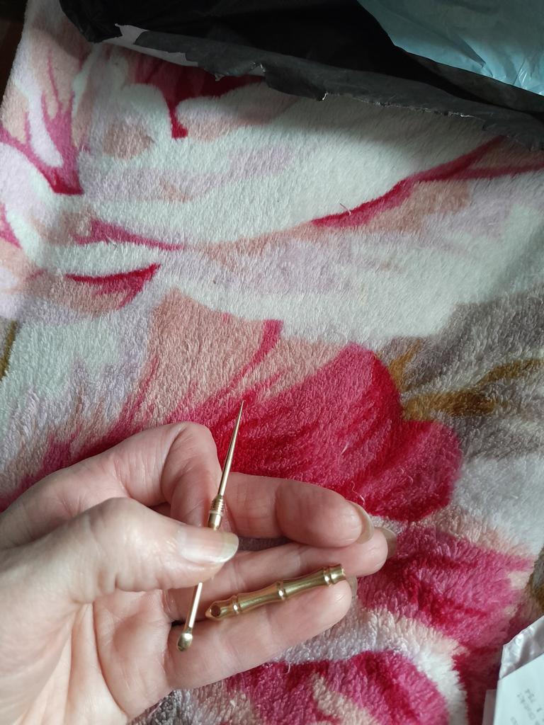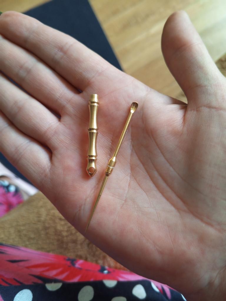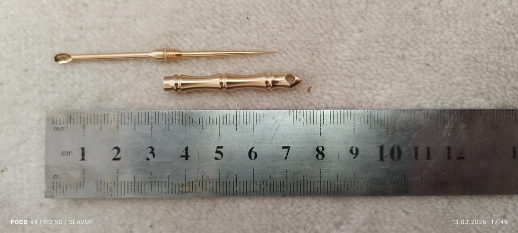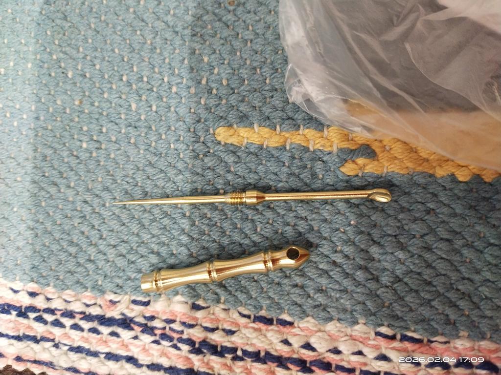 Brass, sharp, the size of a toothpick, looks like a secret cold weapon))