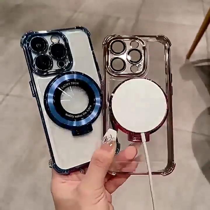 Style:Luxury Plating Bumper Magsafe Magnetic Holder Stand Transparent Protector Case
