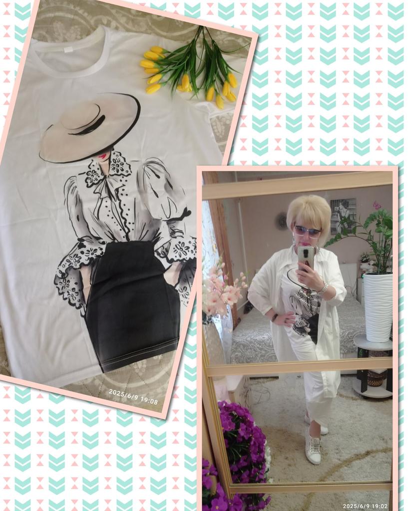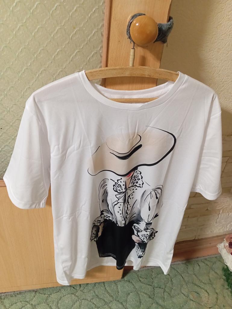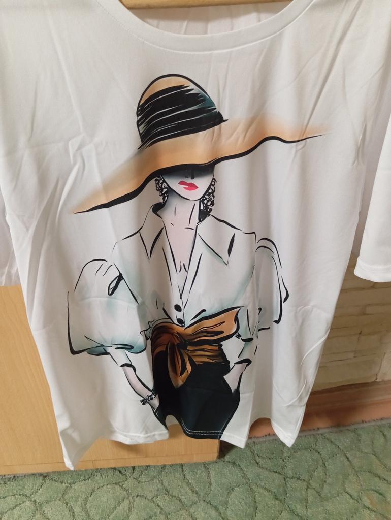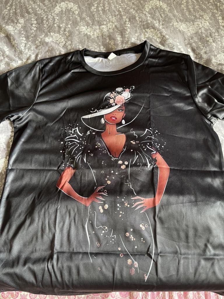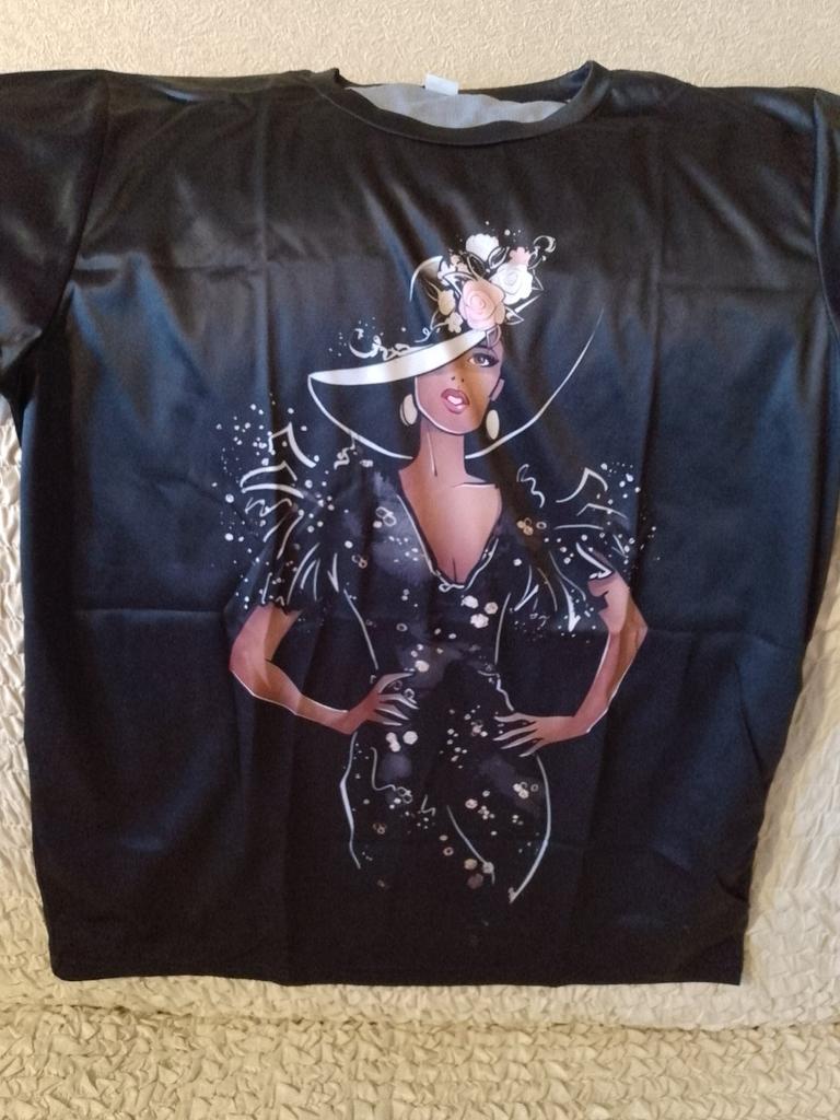 The T-shirt is beautiful. The print is clear and bright. The fabric is one hundred percent synthetic.