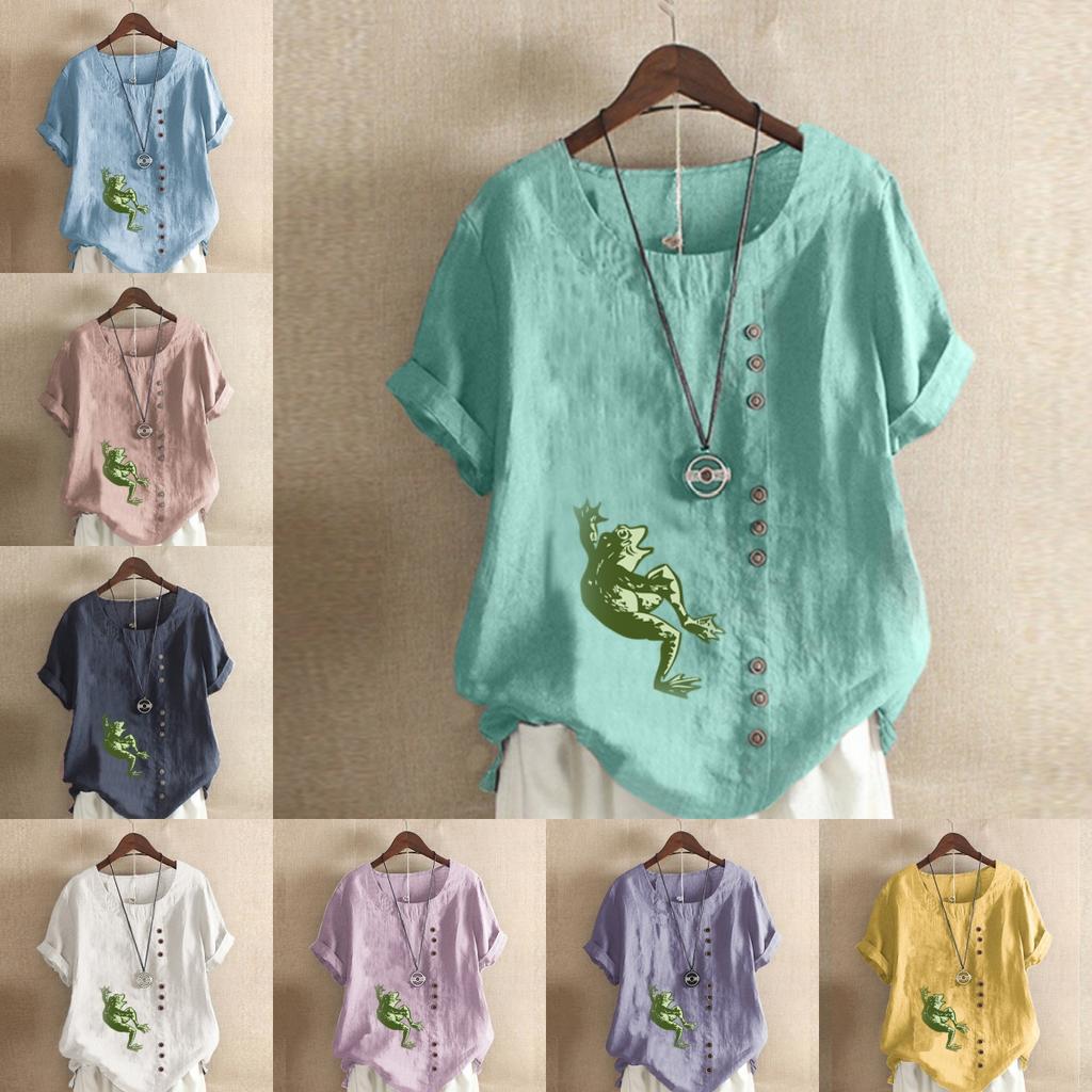 Women's Fashion Frog Prined Short Leeve T-shirt Loose Cotton Shirt Casual Loose Summer Blouse Tops Plus Size