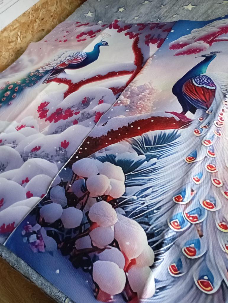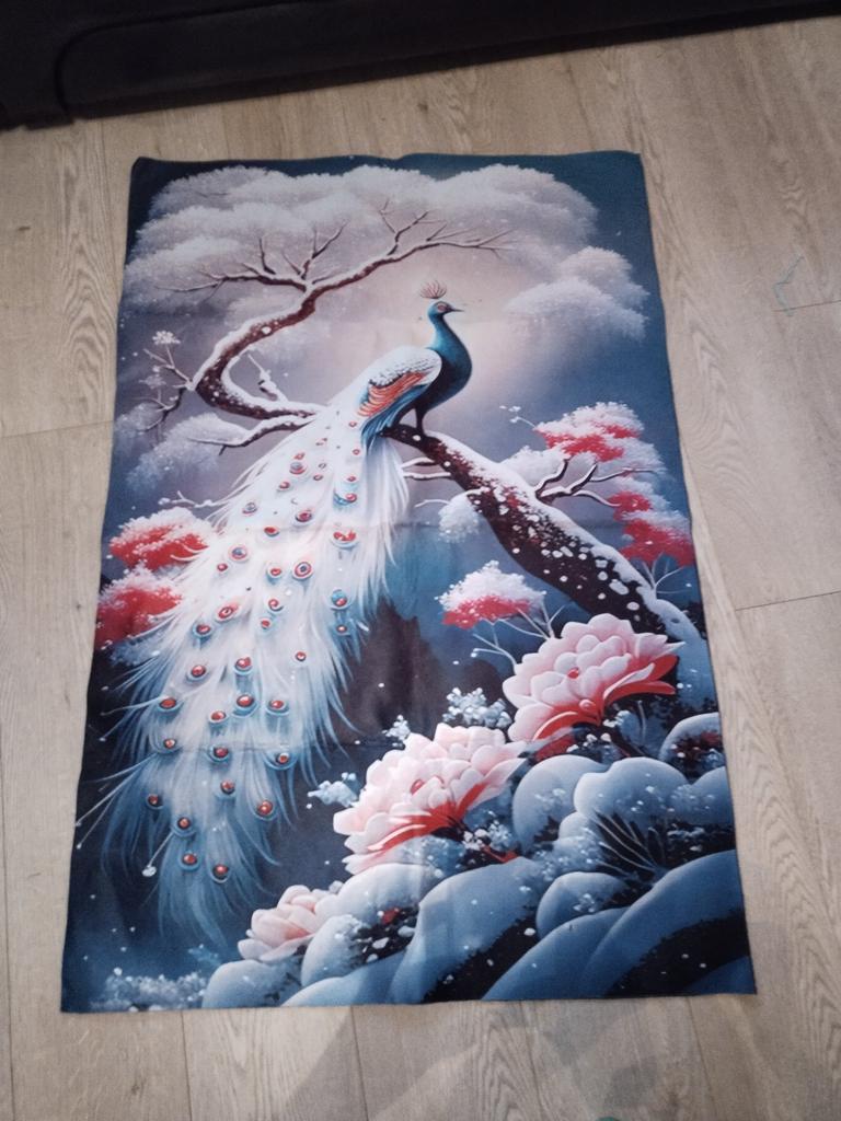 Very beautiful peacock on a purple field of clouds bright and saturated colors soft fabric synthetic base trash does not stick easy to sweep or vacuum