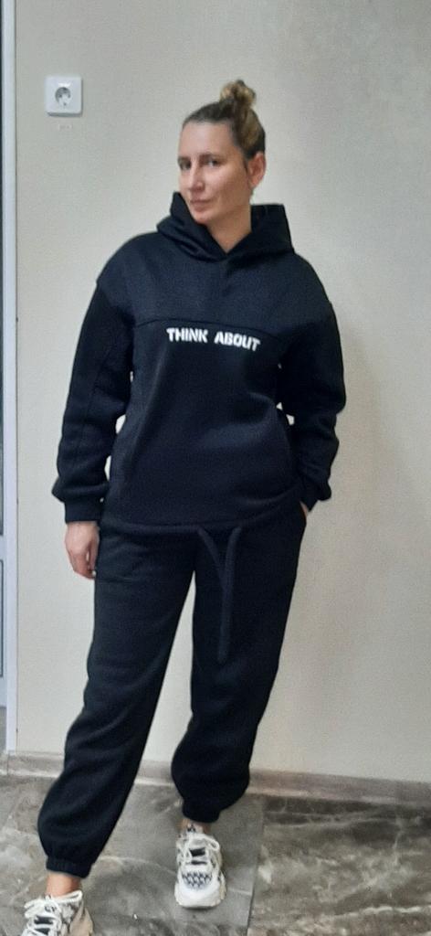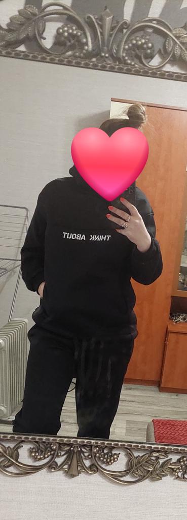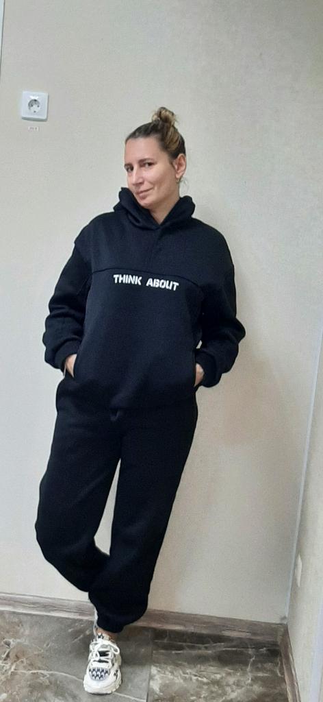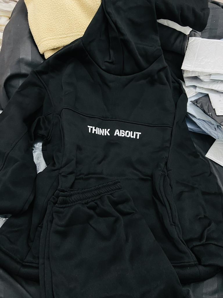 * Statement jogging suit with convertible hoodie * ๐ฅ๐๐ถ๐ฒ๐ณ๐ฒ๐ฟ๐๐ฒ๐ถ๐ 19 Take ๐ฅ๐๐ถ๐ฒ๐ณ๐ฒ๐ฟ๐๐บ๐ณ๐ฎ๐ป๐ด The delivery includes 1 jogging suit consisting of a sweater and pants in the corresponding color and size. The jogging suit is available in several different colors (including pink, black, pink and gray) in sizes S to XL. I ordered the jogging suit in black in size S. I wear size 36 to 38. I weigh 62 kg over 172 cm. Cup size 75D. Dimensions: 90-65-95 cm It fits me very well because it is stretchy and cut quite wide. ๐ฅ๐ค๐๐ฎ๐น๐ถ๐รค๐ The jogging suit is opaque... I think that's good and important. The material is quite thick. The cuffs are elastic but still tight fitting. The sweater has a shape-stable hood and if then at the lower cuff to turn the loose and rather long cut sweater into a crop top sweater. I think it's great that the sleeves of the top are longer than usual and that makes it very comfortable. The front is printed with "think about". The back reads "i don't care". The bottom of the pants has a tight stretchy hem. My trouser legs arenโt too short this time either. The fabric is nice and cozy, warm, thick and soft. For material composition : 95% POLYESTER 5%SPANDEX ๐ฅ๐๐ฎ๐๐ถ๐ Mega beautiful and comfortable statement jogging suit consisting of a sweater with ribbons for tightening the front and comfortable jogging pants made of thick fabric. You can order the jogging suit in its original size. It runs true to size or tends to be one size larger. Thank you also for the hair ties as a little extra gift. ๐