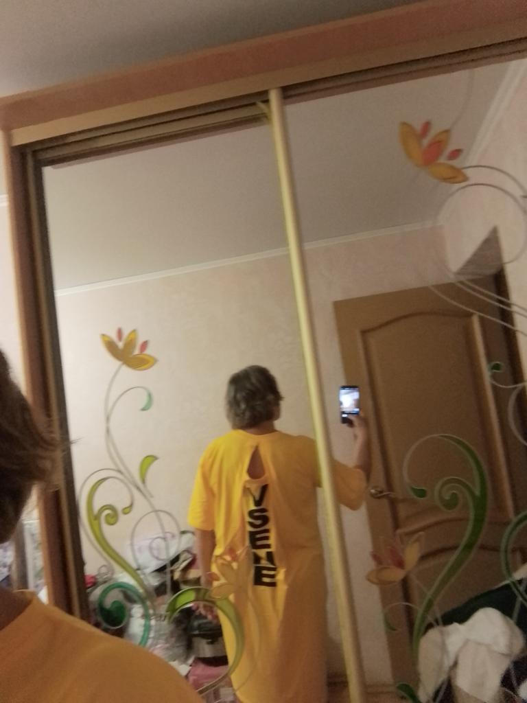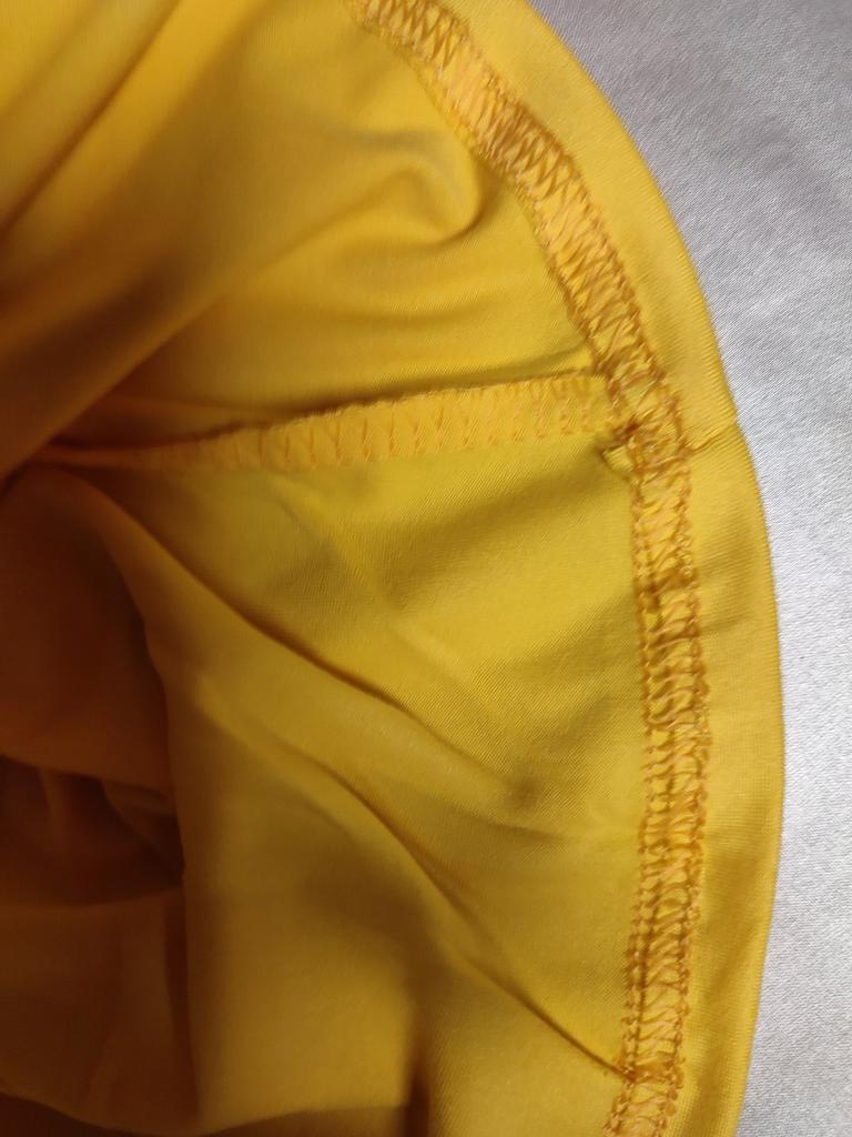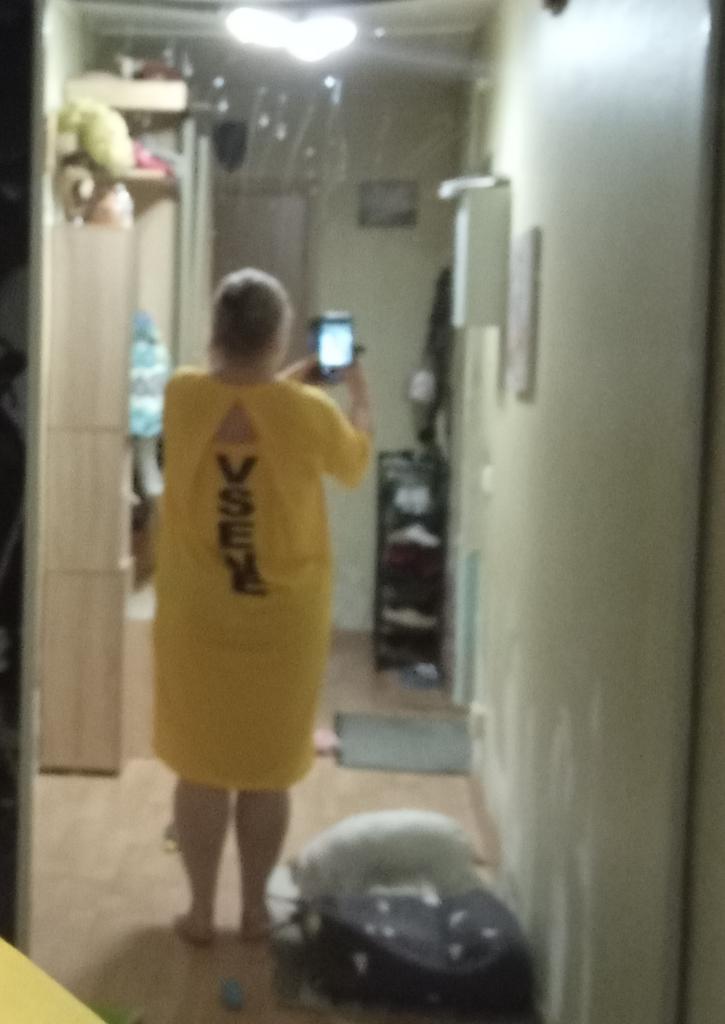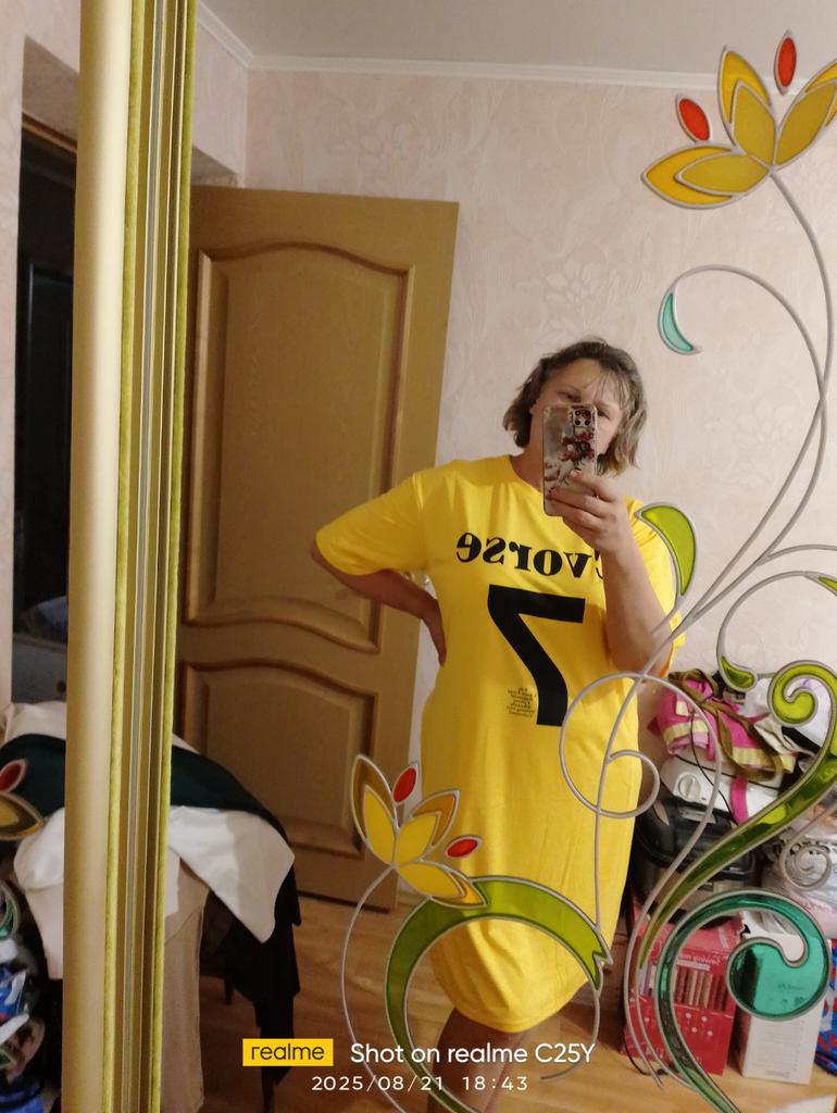 The dress is great. You could have taken a size bigger. My size is 112-98-122. Not tight but I like it looser. The color is bright and saturated, the fabric is thin T-shirt knitwear. It's great for summer..