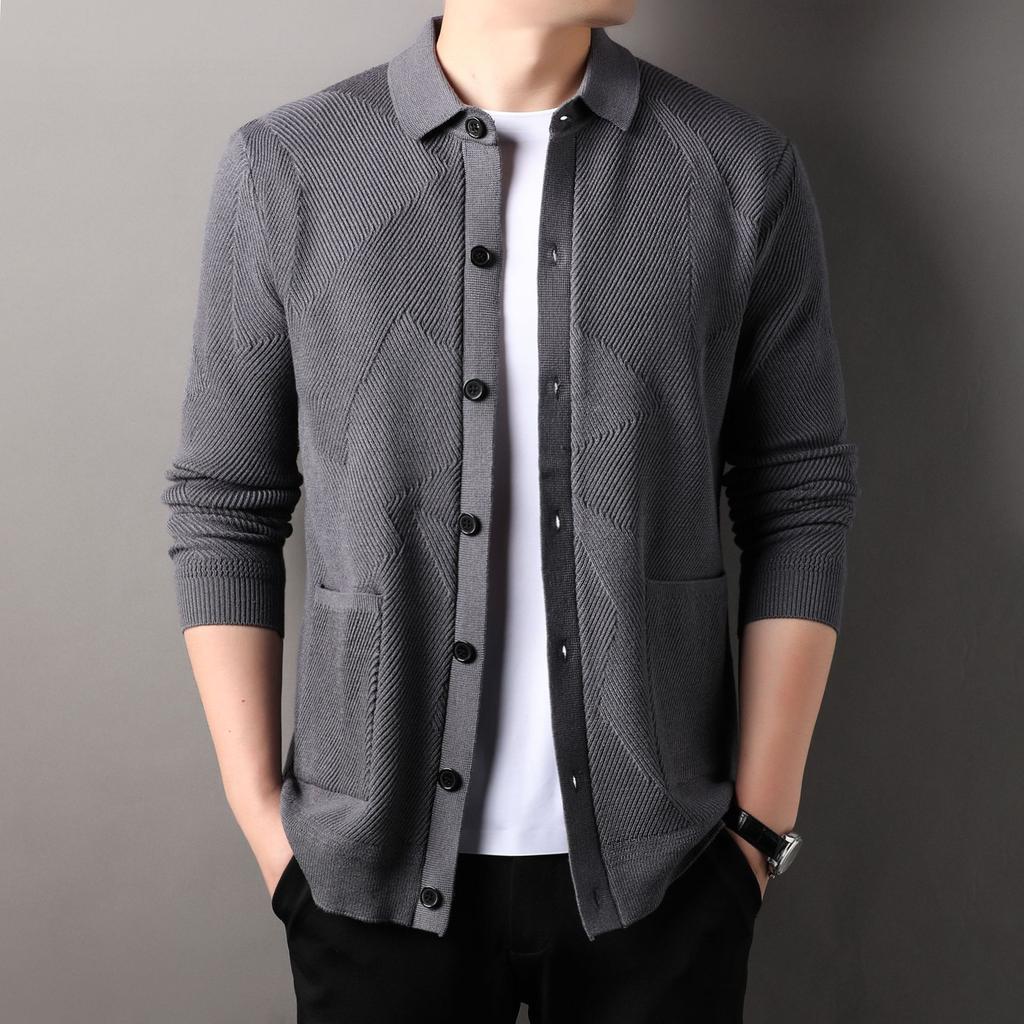Autumn Men's Fashion Solid Color Lapel Jacquard Knitted Cardigan Jacket