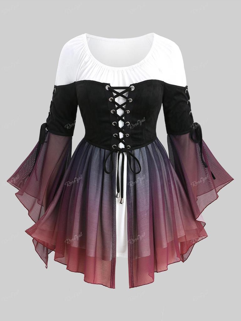 Rosegal Plus Size Lace Up Ombre Mesh Ruched Asymmetrical Flare Sleeve Top