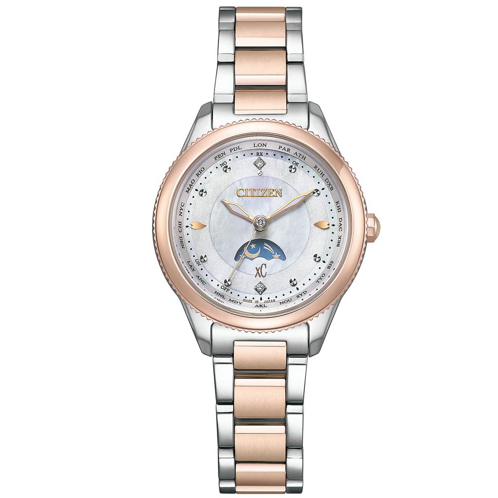 Experience celestial beauty with the Citizen xC EE1007-67W! This women's watch features a stunning diamond-accented dial, Eco-Drive solar technology, radio-controlled timekeeping, and a captivating Sun & Moon display.