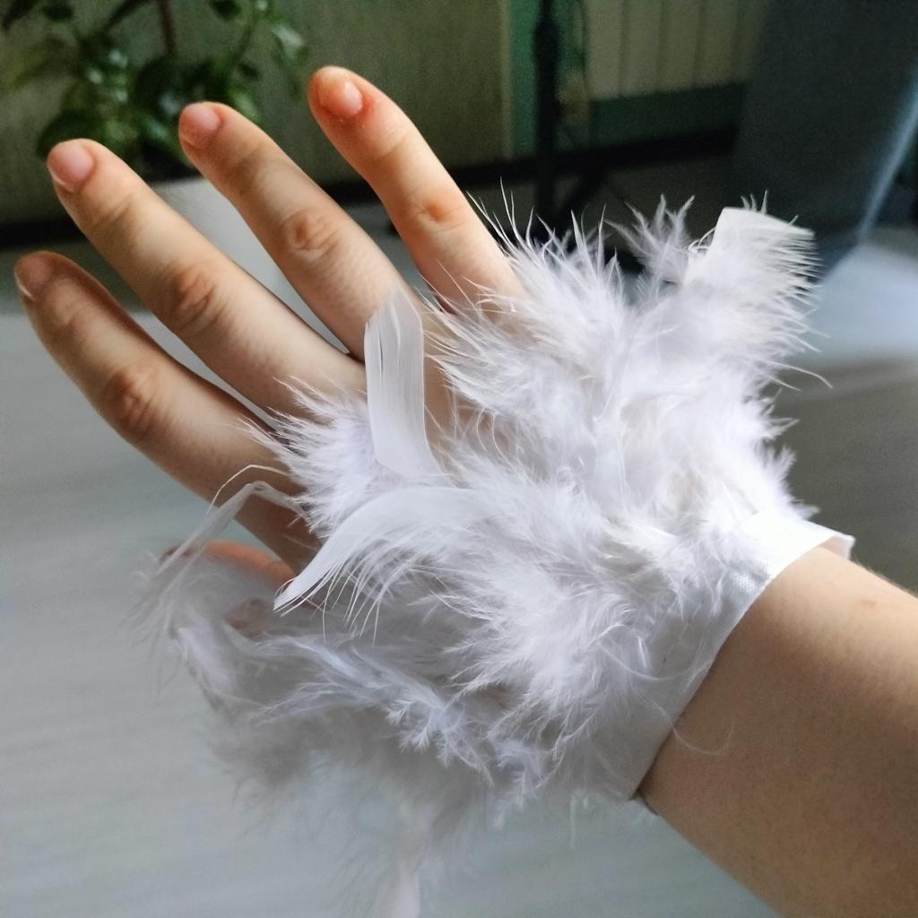 The Velcro is a bit short, it's too big for my hand (hand circumference is 14-15 cm), and if it were made smaller - there wouldn't be enough Velcro). There aren't as many feathers as in the picture, in some places it feels like they're broken off.