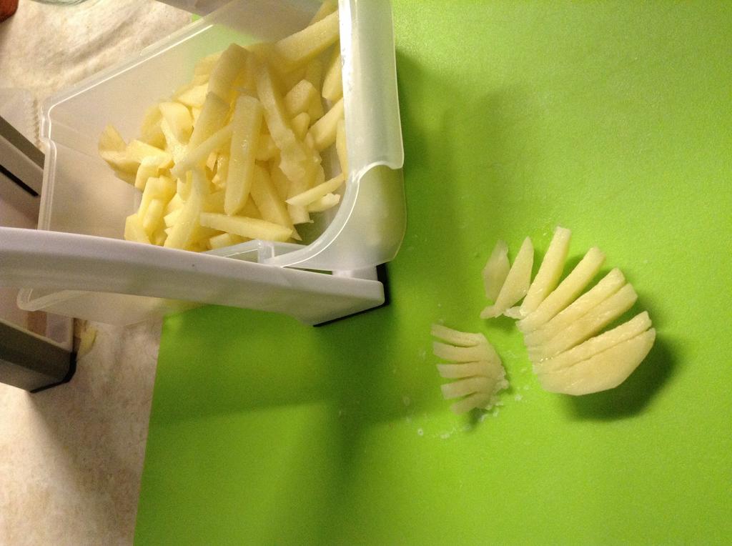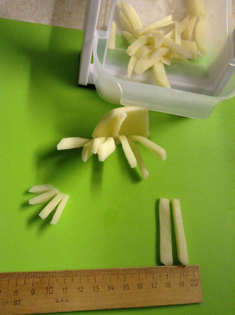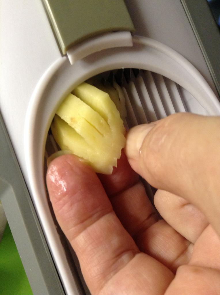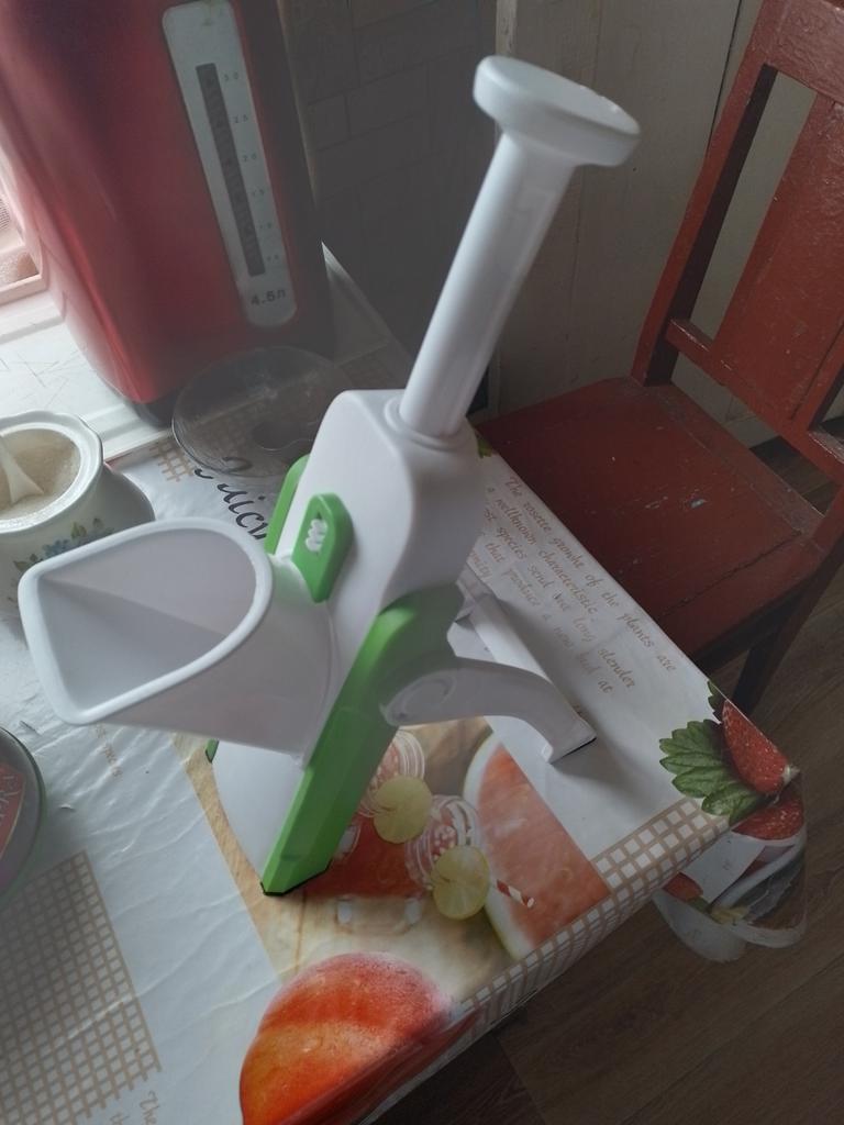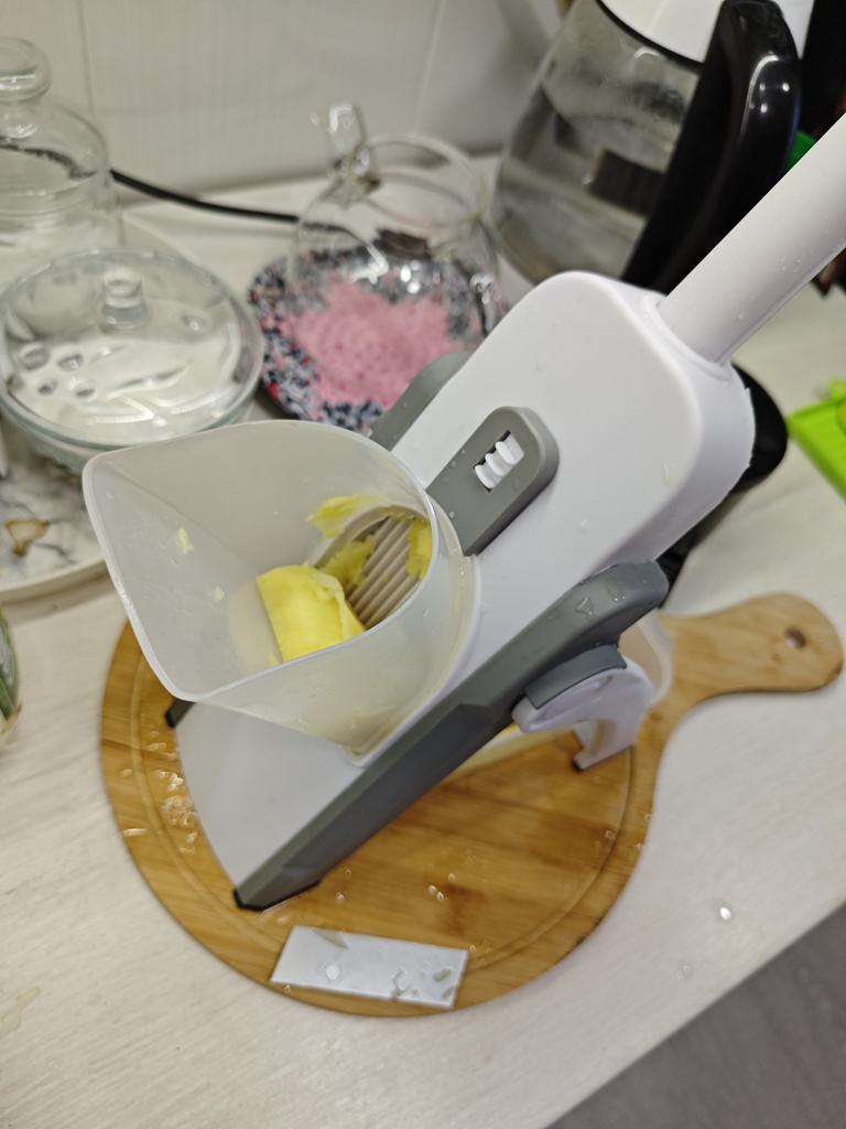Doesn't cut potatoes all the way through, have to separate the slices by hand. The press is tight, you have to apply effort, up to sharp blows. The vegetables fly around to the sides, past the bowl.! The areas where the cutter and the mold join are difficult to reach, even with the brush included in the set. Overall, I am not satisfied with the purchase.