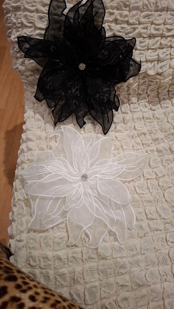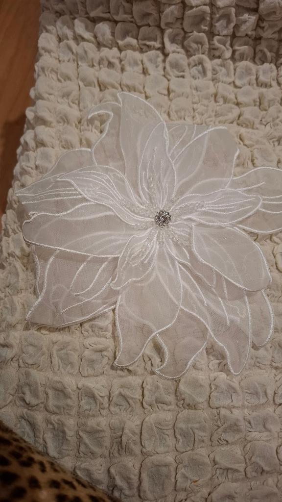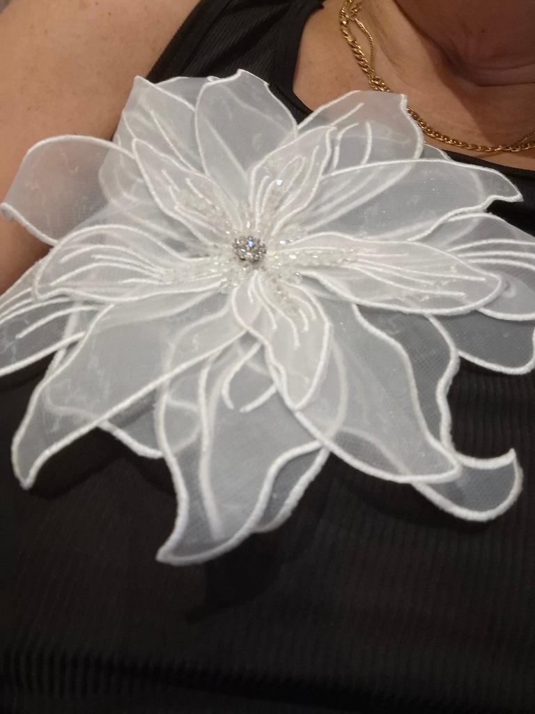 A gorgeous flower that can decorate any blouse, T-shirt, dress... I bought it to decorate a simple white T-shirt. The flower will need to be sewn on, it does not have an adhesive base... The flower itself is made of white chiffon or nylon, in the center the flower is embroidered with beads, it looks very impressive! The base of the flower is a white mesh... The quality of workmanship is excellent! Quite large, 20-23 cm in diameter...