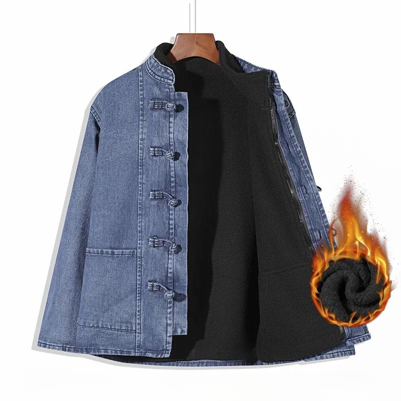 Tang Suit Men's Plus Velvet Denim Jacket Men's Spring and Autumn Chinese Style Jacket Retro Men's Hanfu Tunic Men's Long Sleeves