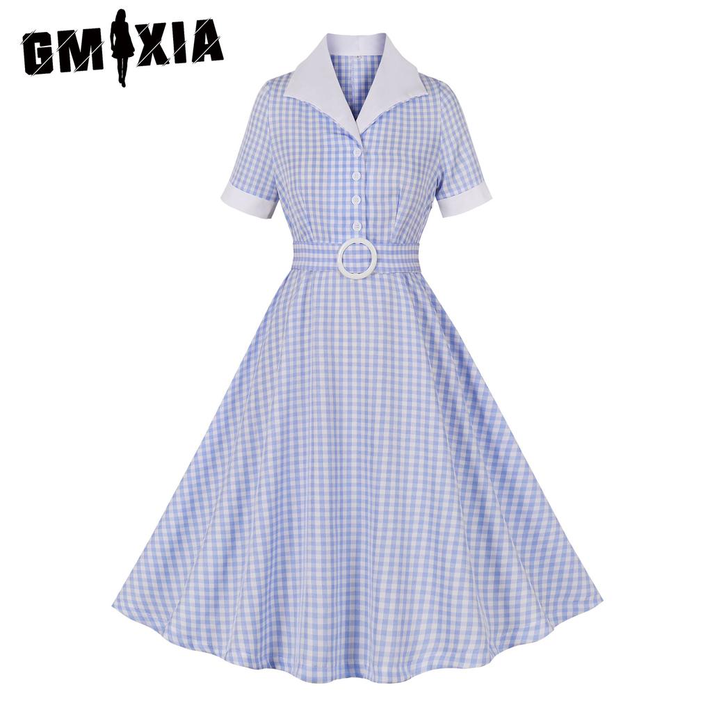 GMXIA Women's Hepburn Style Contrast Color Lapel Vintage Slim Lace-up Plaid Swing Mid-length Dress