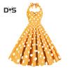 Introducing our stunning Women's Vintage Rockabilly dress, a perfect choice for any special occasion. Whether you're attending a wedding, graduation, cocktail party, or going on vacation, this dress will make you look elegant and timeless. The sexy backless style with an invisible zipper on the back ensures easy wearing and removal. Inspired by the classic 1950s movie style, this dress features a sleeveless sweetheart neckline halterneck design that highlights your feminine silhouette. The retro polka dot print adds a touch of vintage charm, while the suspender straps and tube top waist create a unique look. Made with high-quality materials, this dress is comfortable to wear all day long. Suitable for everyday wear or special events like rockabilly parties or homecoming dances, this dress is sure to make heads turn. Don't miss out on this must-have addition to your wardrobe.