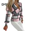 Introducing our stylish and versatile women's V-neck shirt, perfect for any occasion. Made with a blend of polyester and spandex, this shirt offers ultimate comfort, breathability, and a lightweight feel. The slim fit design is tailored to hide the belly and flatter any body type. The contrasting color splicing adds a touch of elegance to your overall outfit, making it suitable for work, parties, vacations, and more. With long sleeves and an OL commuter style, this shirt can be easily paired with jeans, casual pants, skirts, or leggings for a trendy look. Whether you wear it alone or layer it with a cardigan on colder days, this top is a must-have addition to your wardrobe. Upgrade your style with our women's V-neck shirt today!