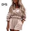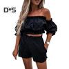 Stylish Design: This shorts set features a off-shoulder neckline, ruffled puff sleeves, and wooden ears on the waistband, giving it a trendy and fashionable look.
