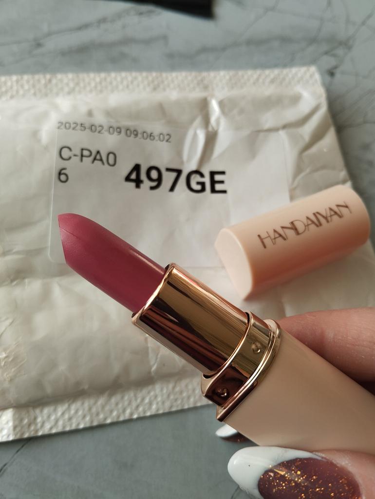 Lipstick 💄 of the HANDAIYAN brand ❤️ Shade #05. Lipstick looks luxurious. The design of the case is restrained and laconic, but every detail, from shape to color, is thought out. Nude colors in combination with gold letters create an aura of quiet luxury. No gypsy baroque, just a sophisticated style. The quality of the lipstick is also top notch. The creamy texture fits well on the lips, does not dry out, is very comfortable ❤️. I definitely recommend it. Lipstick is worth attention. If the information was useful, put it as a favorite ❤️ I received the goods in 18 days in a combined package 🚚. The track was tracked completely. The arrival at the point of issue was announced by sms 📲. Packaging: bubble bag. The box is sealed in mica, all the necessary information is present. Expiry dates are indicated. Happy shopping and fast deliveries to everyone 🛍️☺️🚀🌹 And remember that every woman is a star, so shine brighter 🌞 ❤️ PS: Need promo codes? Then be sure to visit my Telegram channel Olena.joom.thebest (t.me/olenajoom), where I regularly publish promo codes to make your purchases even more profitable 😘🛍️.