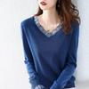 Loose V-neck Knitted Sweater Autumn Winter Solid Color Splicing Pullover Top