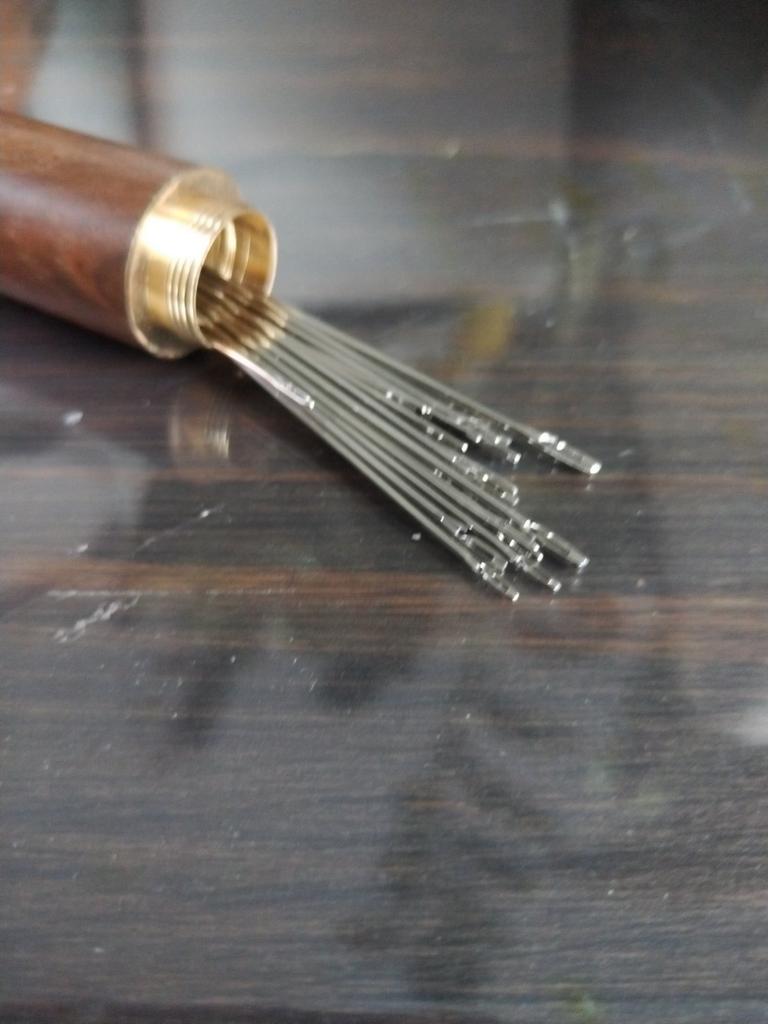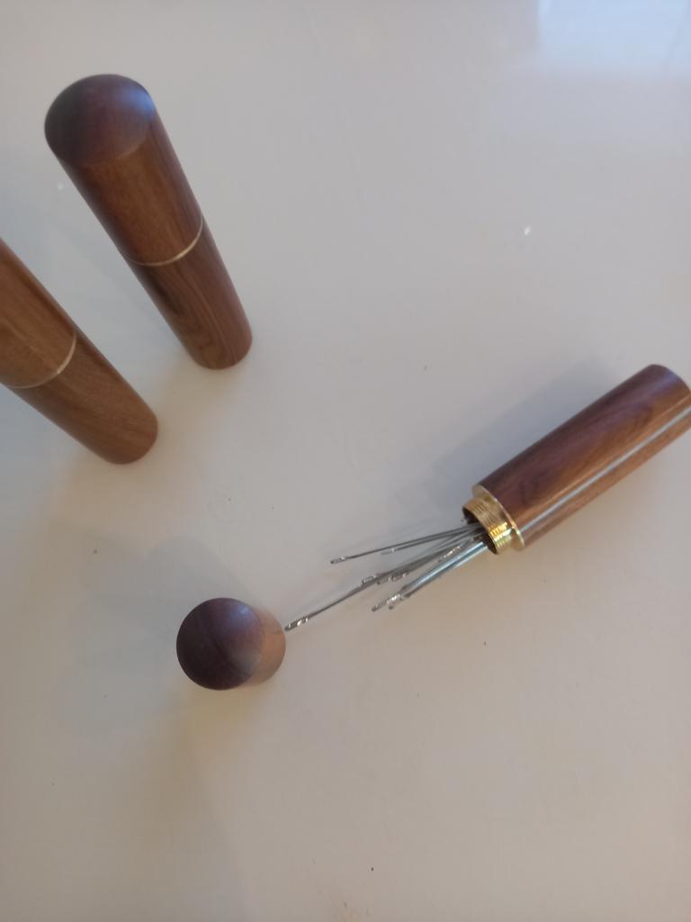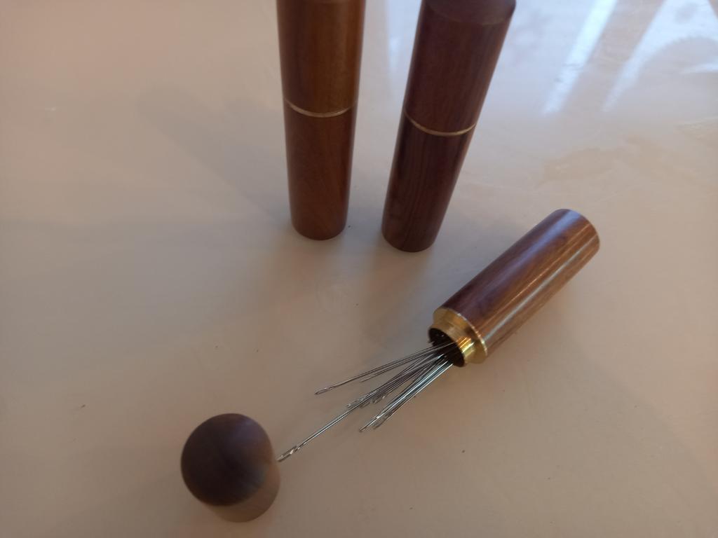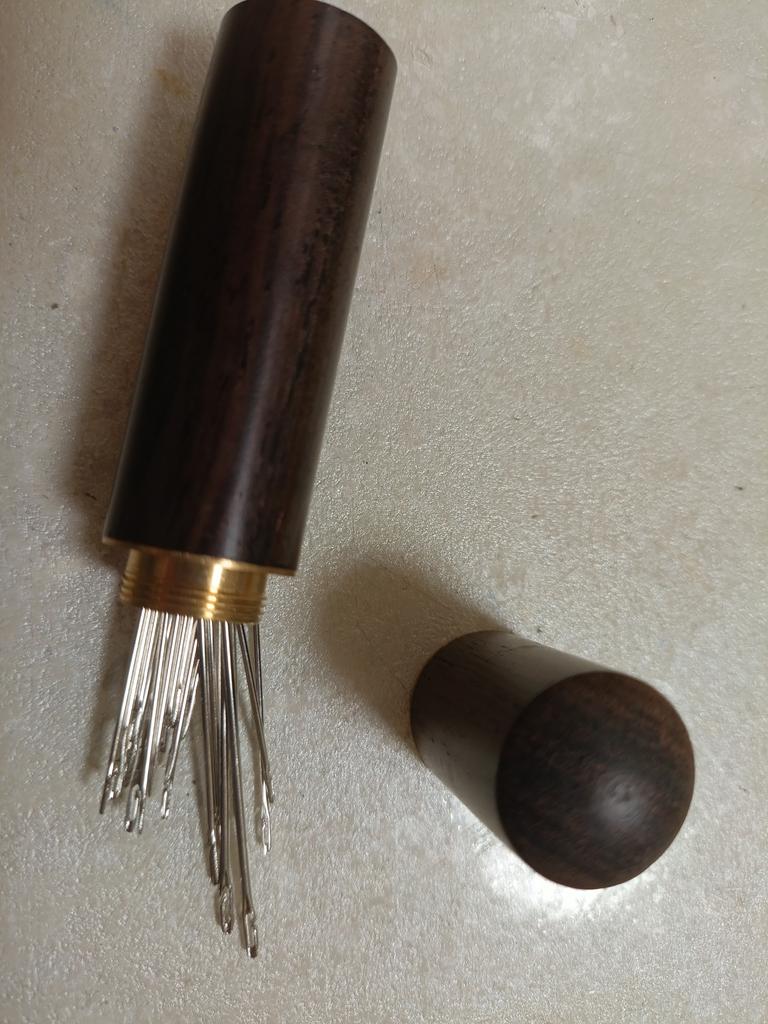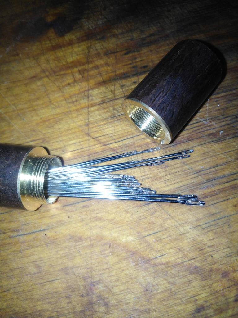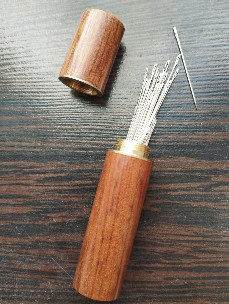 Set of needles in a wooden tube. Special needles make it easy to thread. You need to adapt to them.