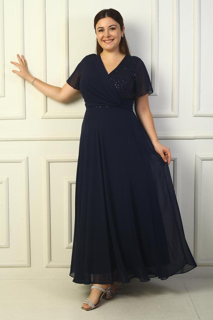 Women's Double-Breasted Front Knotted Sequin Detailed Lined Plus Size Long Chiffon Dress