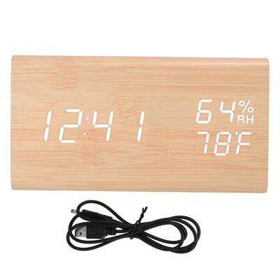 Rectangular Home Bedroom Electronic Temperature and Humidity Alarm Clock USB Voice Control LED Brightness Adjustment Digital Wood Clock
