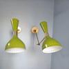 Transform your space with these exquisite 1950's Italian Olive Brass Diabolo Mid Century Wall Sconces. Crafted with timeless elegance in mind, each light features a sleek brass body complemented by a vibrant olive green color that evokes the charm of mid-century design.